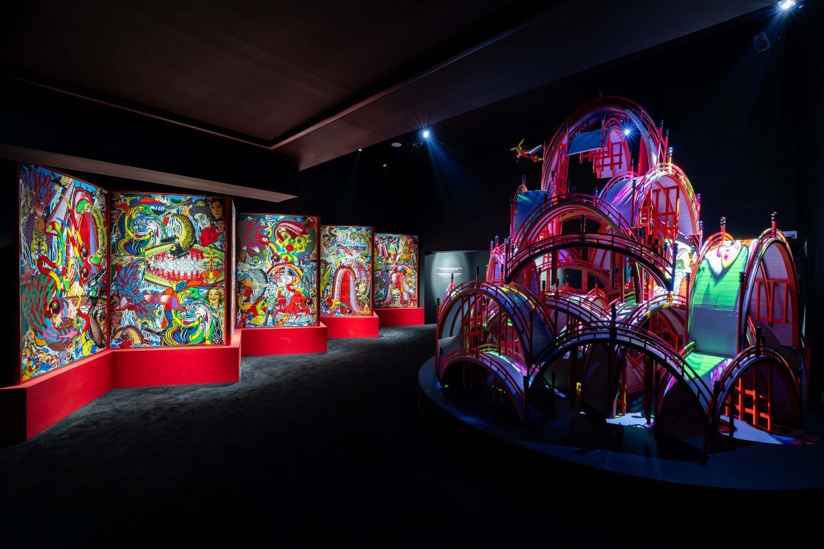대림미술관에서 열리고 있는 ‘케이이치 타나아미: I’M THE ORIGIN’ 전시 전경. 오른쪽에 보이는 작품은 타나아미의 대표작 중 하나인 ‘백 개의 다리’로, 강렬한 색채와 반복적인 구조물이 어우러진 설치 작품이다. 사진제공ㅣ 대림미술관