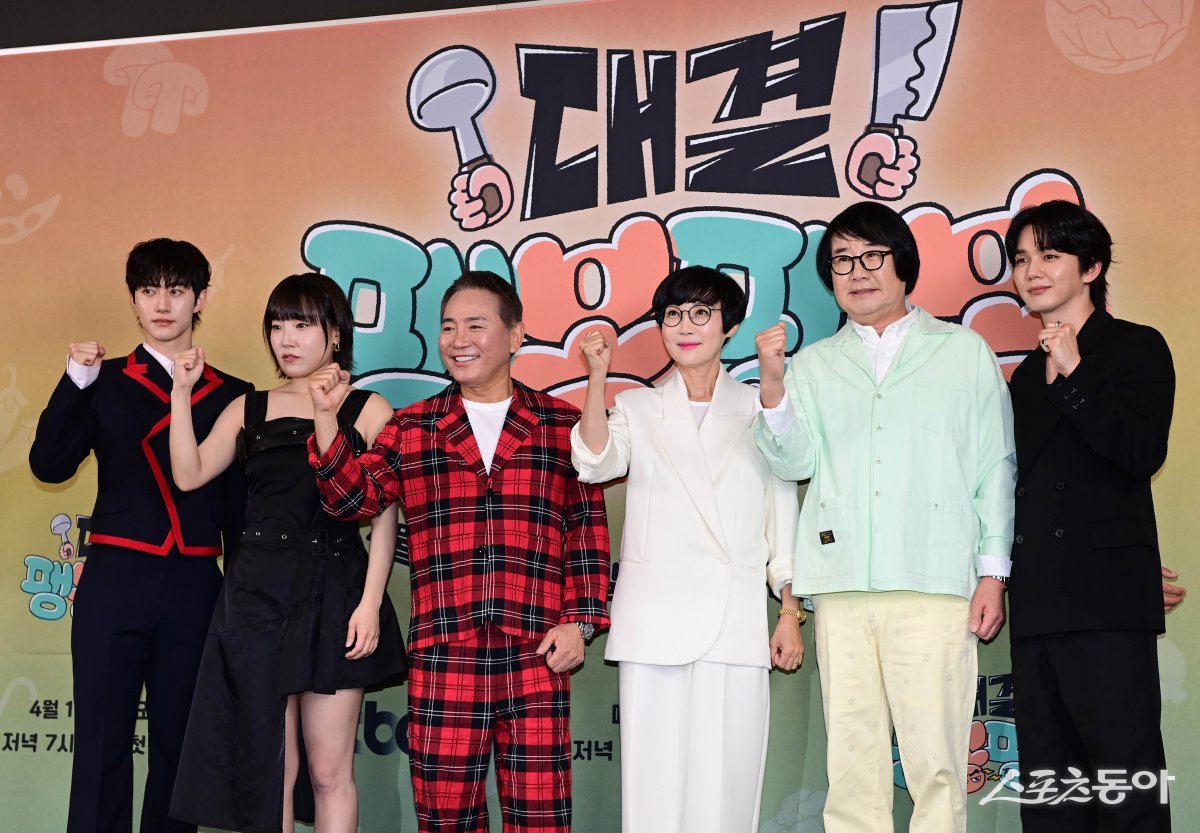 배우 곽동연, 코미디언 이은지, 이봉원, 팽현숙, 최양락, 유승호가 17일 서울 마포구 스탠포드호텔에서 열린 JTBC 새 예능프로그램 ‘대결! 팽봉팽봉’ 제작발표회에서 포즈를 취하고 있다. 주현희 기자 teth1147@donga.com