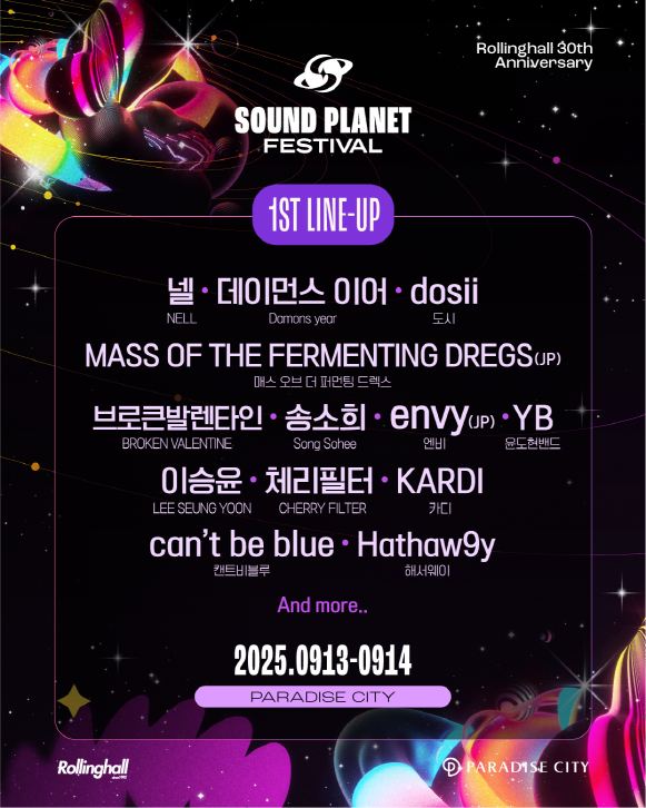 롤링홀이 개관 30주년 기념하여 첫 대형 페스티벌인 ‘2025 사운드플래닛 페스티벌(2025 SOUND PLANET FESTIVAL)’을 개최하는 가운데 1차 라인업부터 화려하다.