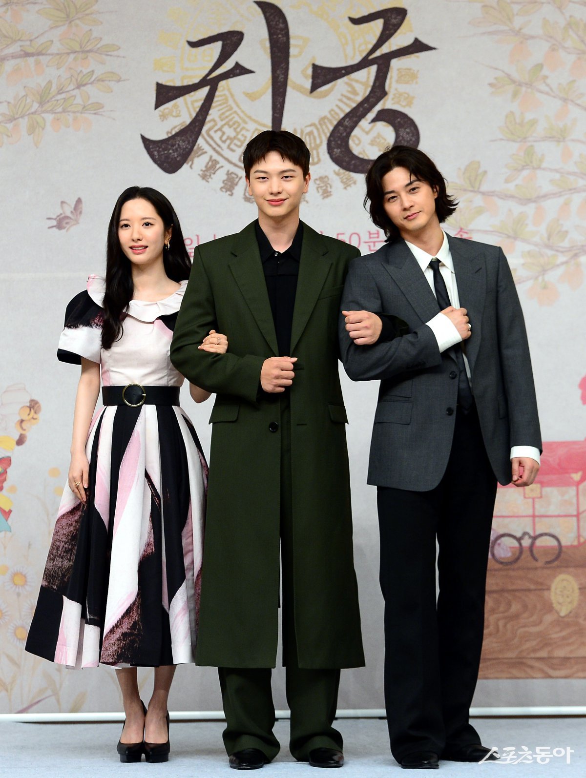 17일 오후 서울 양천구 목동 SBS 사옥에서 열린 SBS 새 금토드라마 ‘귀궁’ 제작발표회에 참석한 김지연, 육성재, 김지훈이 카메라를 향해 포즈를 취하고 있다. 김민성 기자 marineboy@donga.com
