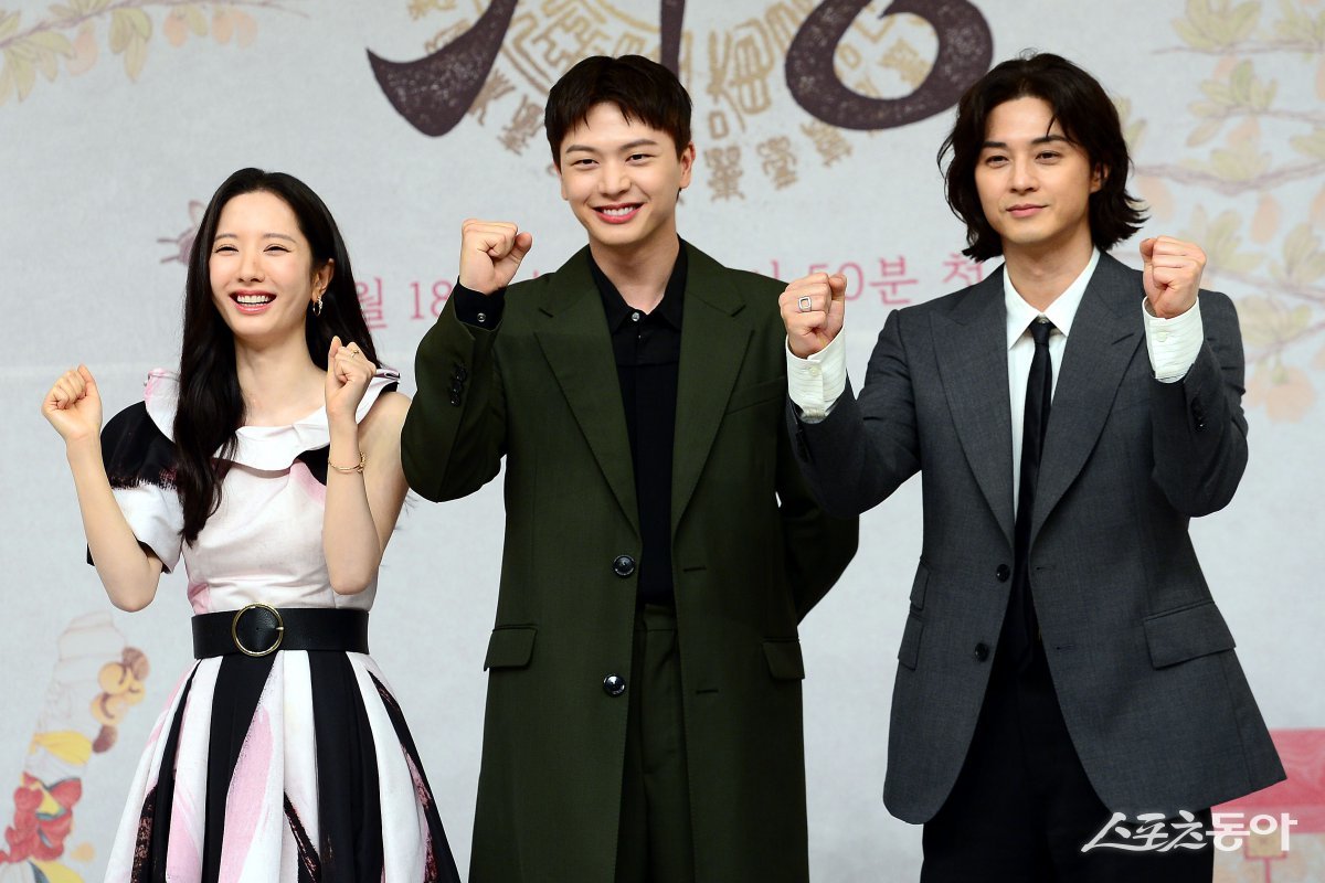 17일 오후 서울 양천구 목동 SBS 사옥에서 열린 SBS 새 금토드라마 ‘귀궁’ 제작발표회에 참석한 김지연, 육성재, 김지훈이 카메라를 향해 포즈를 취하고 있다. 김민성 기자 marineboy@donga.com