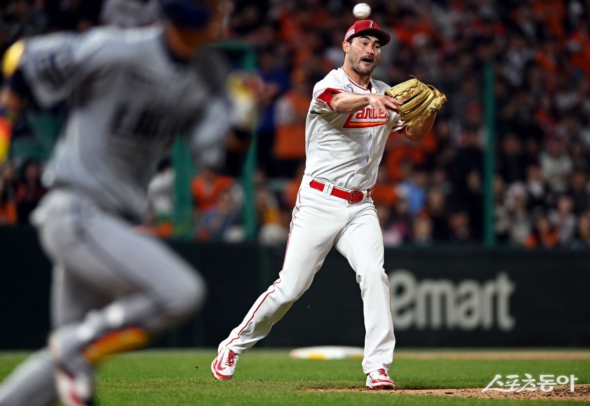 17일 인천 SSG 랜더스필드에서 ‘2025 신한 SOL 뱅크 KBO리그’ SSG 랜더스와 한화 이글스의 경기가 열렸다. 5회초 무사에서 SSG 선발 화이트가 번트 타구를 잡아 1루로 송구하고 있다. 인천 | 김민성 기자 marineboy@donga.com