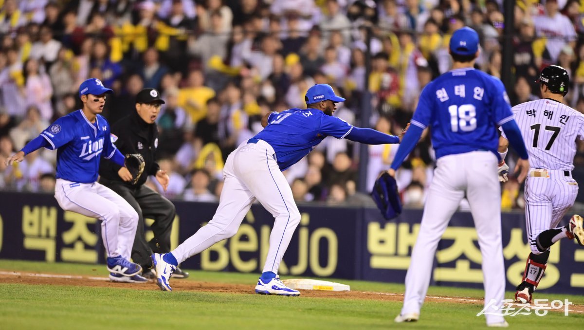 17일 서울 잠실야구장에서 열린 ‘2025 신한 SOL Bank KBO리그’ 삼성 라이온즈와 LG 트윈스의 경기에서 5회말 무사 LG 박해민의 번트 때 삼성 1루수 디아즈가 타자 주자에게 태그를 시도하고 있다. 잠실 | 주현희 기자 teth1147@donga.com
