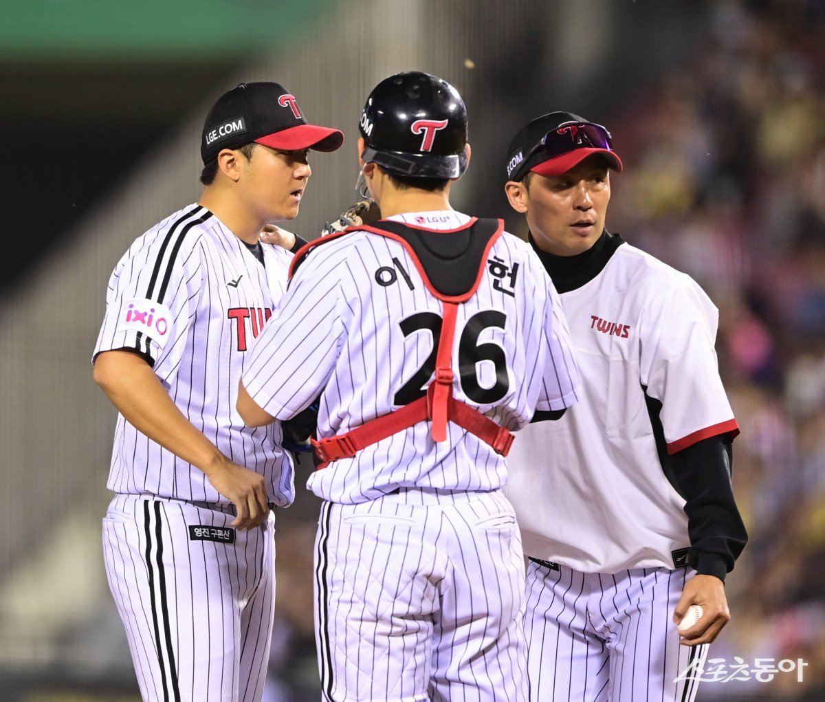 17일 서울 잠실야구장에서 열린 ‘2025 신한 SOL Bank KBO리그’ 삼성 라이온즈와 LG 트윈스의 경기에서 5회초 2사 2루 상황에서 LG 선발 투수 송승기가 마운드를 내려가고 있다. 잠실 | 주현희 기자 teth1147@donga.com