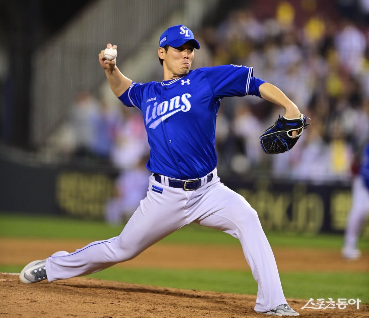 17일 서울 잠실야구장에서 열린 ‘2025 신한 SOL Bank KBO리그’ 삼성 라이온즈와 LG 트윈스의 경기에서 9회말 무사 1, 2루 상황에서 삼성 김재윤이 교체로 마운드에 올라 역투하고 있다. 잠실 | 주현희 기자 teth1147@donga.com