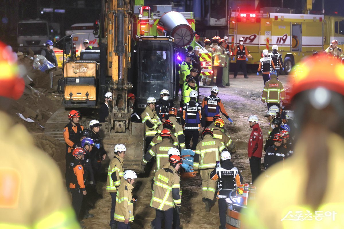 지난 16일 오후 구조대원들이 신안산선 공사현장 붕괴사고 실종자를 수습해 옮기고 있다. 사진제공|광명시