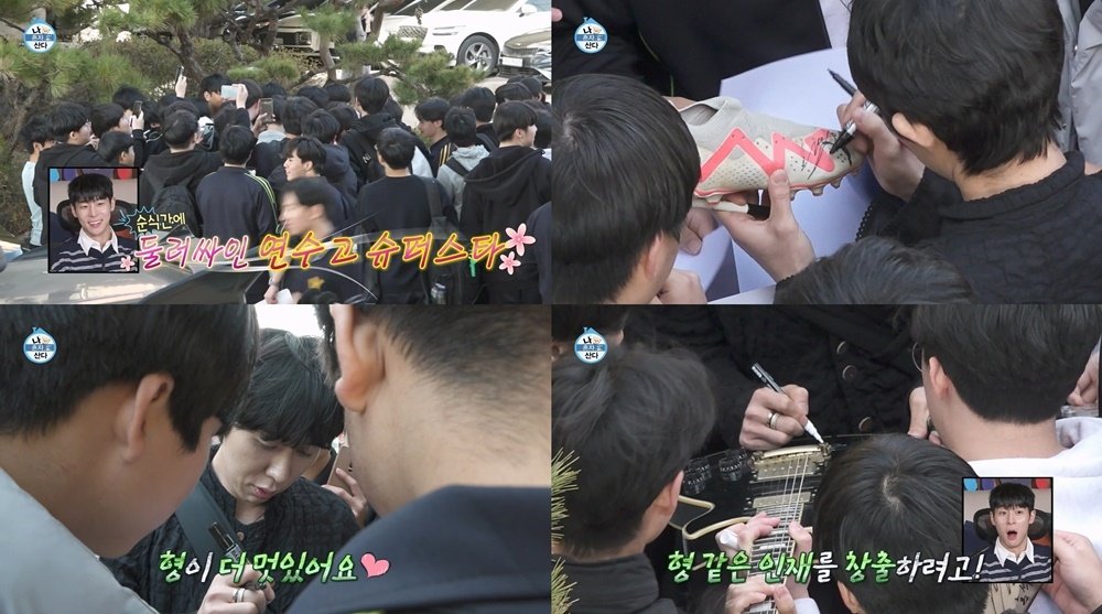 후배들의 뜨거운 환영과 쇄도하는 사인 요청에 코드쿤스트는 한 명 한 명 이름을 물어보며 고마운 마음을 담아 사인을 선물한다. 농구공부터 축구화, 기타, 신고 있던 운동화 등 자신의 가장 소중한 물건에 ‘슈퍼스타’의 사인을 받는 후배들의 모습이 웃음을 자아낸다. 남고생들의 에너지에 압도당한 코드쿤스트가 ‘코 교수’가 되어 어떤 강의를 펼칠지 기대가 쏠린다.