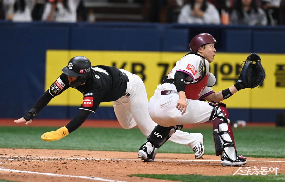20일 서울 고척스카이돔에서 ‘2025 신한은행 SOL뱅크 KBO리그’ KT 위즈와 키움 히어로즈 경기가 열렸다. 5회초 1사 2,3루 KT 외야 뜬공 때 3루주자 오윤석이 태그업 시도해 홈에서 세이프 되고 있다. 고척|김종원 기자 won@donga.com