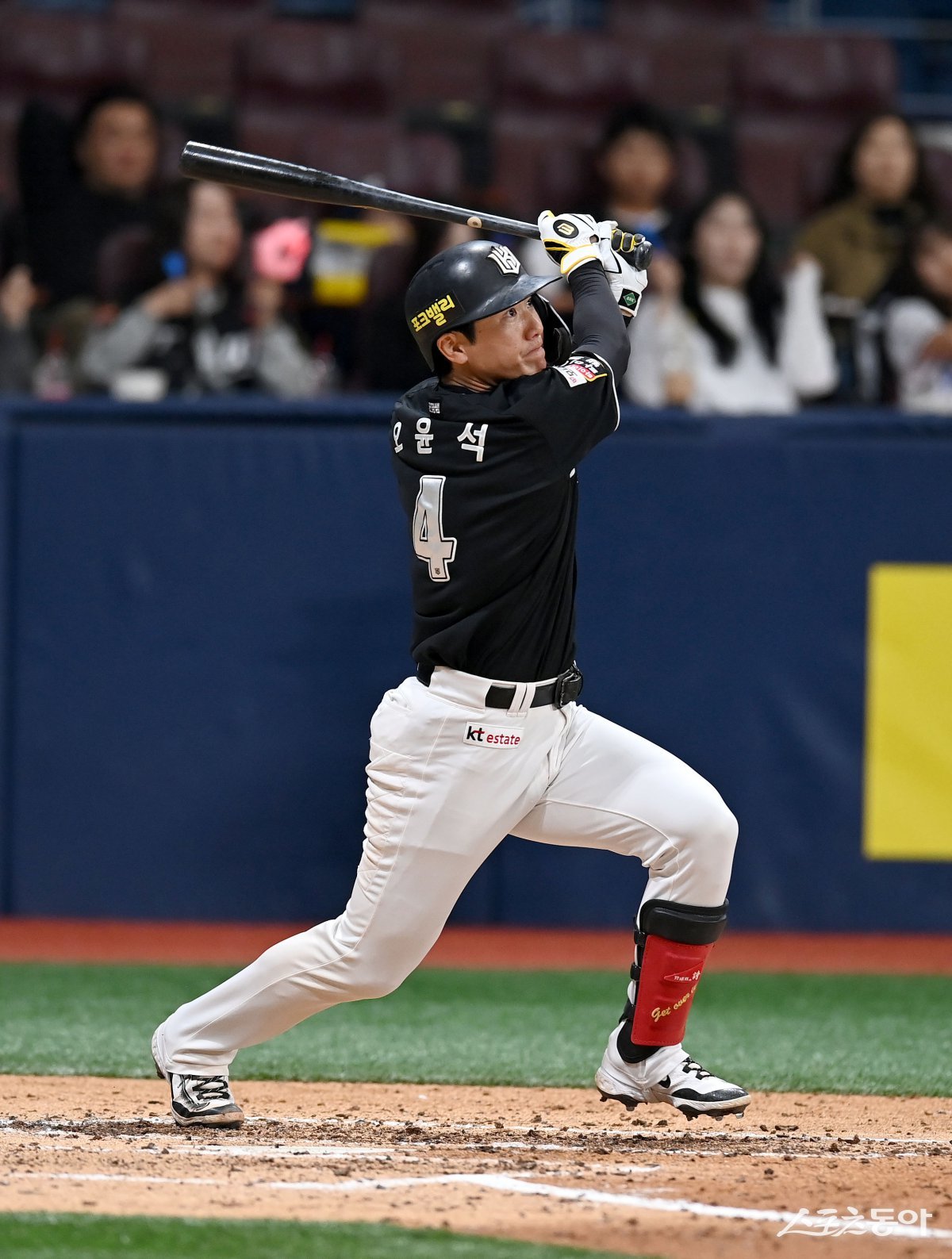20일 서울 고척스카이돔에서 ‘2025 신한은행 SOL뱅크 KBO리그’ KT 위즈와 키움 히어로즈 경기가 열렸다. 5회초 1사 KT 오윤석이 중전 안타를 치고 있다. 고척|김종원 기자 won@donga.com