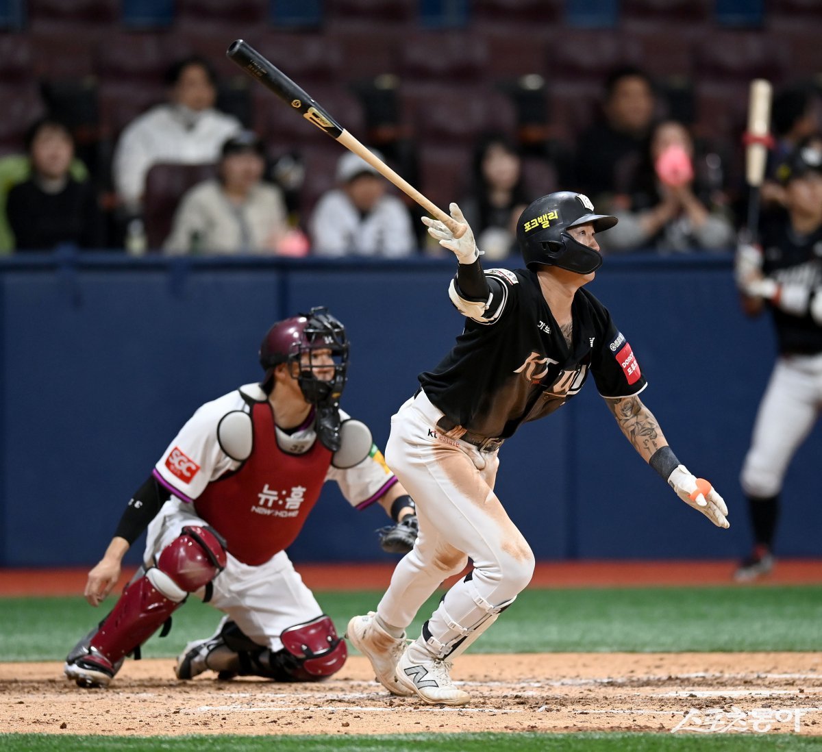 20일 서울 고척스카이돔에서 ‘2025 신한은행 SOL뱅크 KBO리그’ KT 위즈와 키움 히어로즈 경기가 열렸다. 6회초 2사 1,2루 KT 김민혁이 1타점 우전 안타를 치고 있다. 고척|김종원 기자 won@donga.com