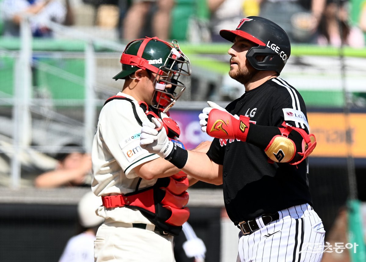 20일 인천 SSG 랜더스필드에서 ‘2025 신한 SOL 뱅크 KBO리그’ SSG 랜더스와 LG 트윈스의 경기가 열렸다. 4회초 무사 1, 3루에서 LG 오스틴이 3점 홈런을 쏘아 올린 후 환호하고 있다. 인천 | 김민성 기자 marineboy@donga.com