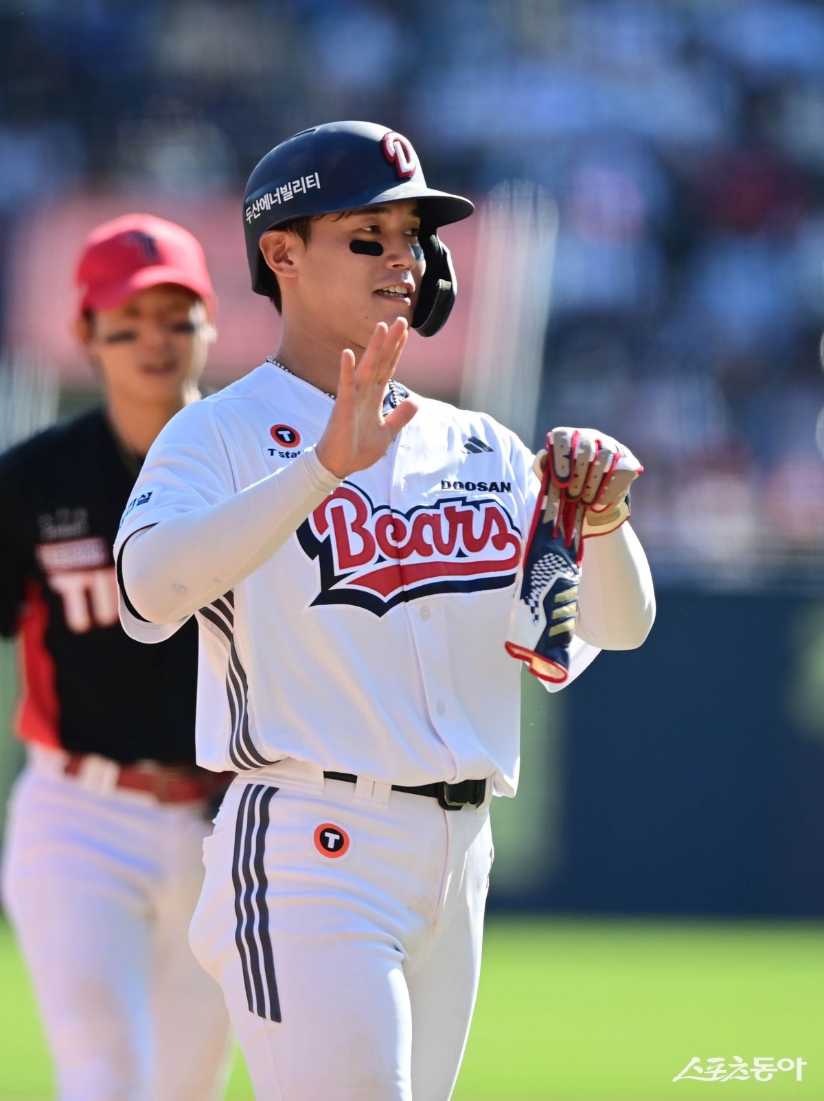 20일 서울 잠실야구장에서 열린 ‘2025 신한 SOL Bank KBO리그’ KIA 타이거즈와 두산 베어스의 경기에서 6회말 2사 2, 3루 선취 2타점 우전 적시타를 친 두산 박준영이 이닝 종료 후 3루코치와 하이파이브를 하고 있다. 잠실 | 주현희 기자 teth1147@donga.com