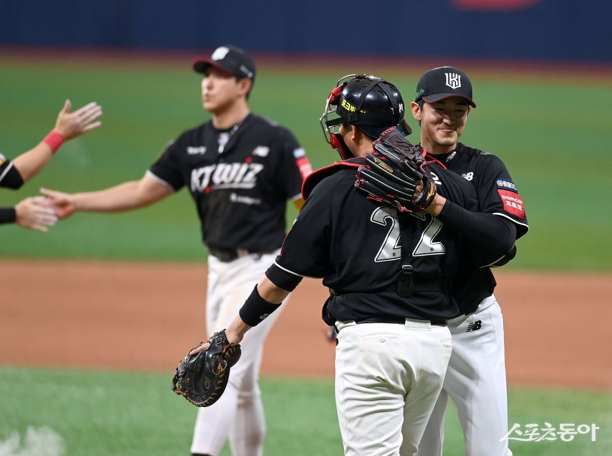 20일 서울 고척스카이돔에서 ‘2025 신한은행 SOL뱅크 KBO리그’ KT 위즈와 키움 히어로즈 경기가 열렸다. 선발 등판한 KT 고영표가 9이닝 3피안타 완봉승을 거둔 후 기뻐하고 있다. 고척|김종원 기자 won@donga.com