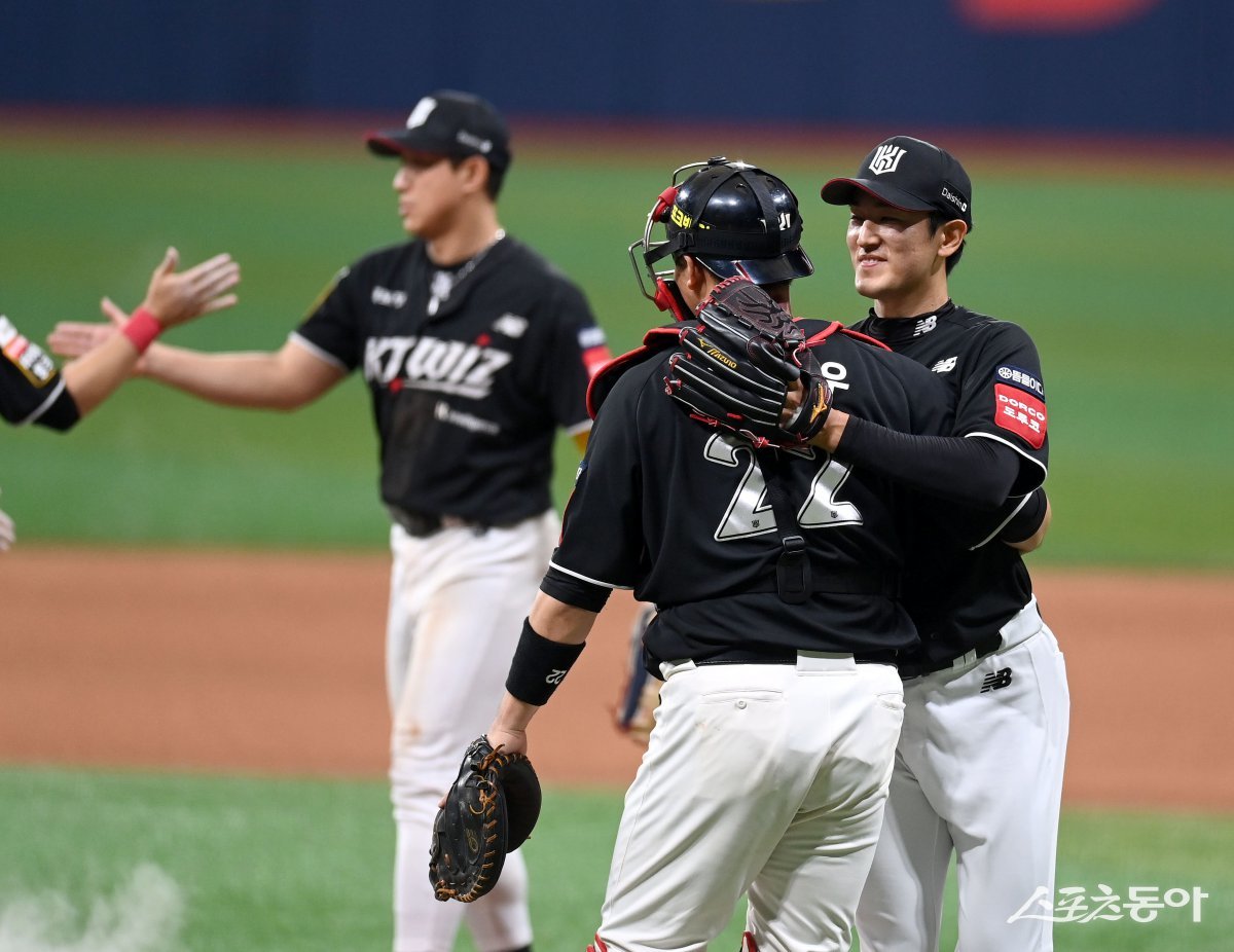 20일 서울 고척스카이돔에서 ‘2025 신한은행 SOL뱅크 KBO리그’ KT 위즈와 키움 히어로즈 경기가 열렸다. 선발 등판한 KT 고영표가 9이닝 3피안타 완봉승을 거둔 후 기뻐하고 있다. 고척|김종원 기자 won@donga.com