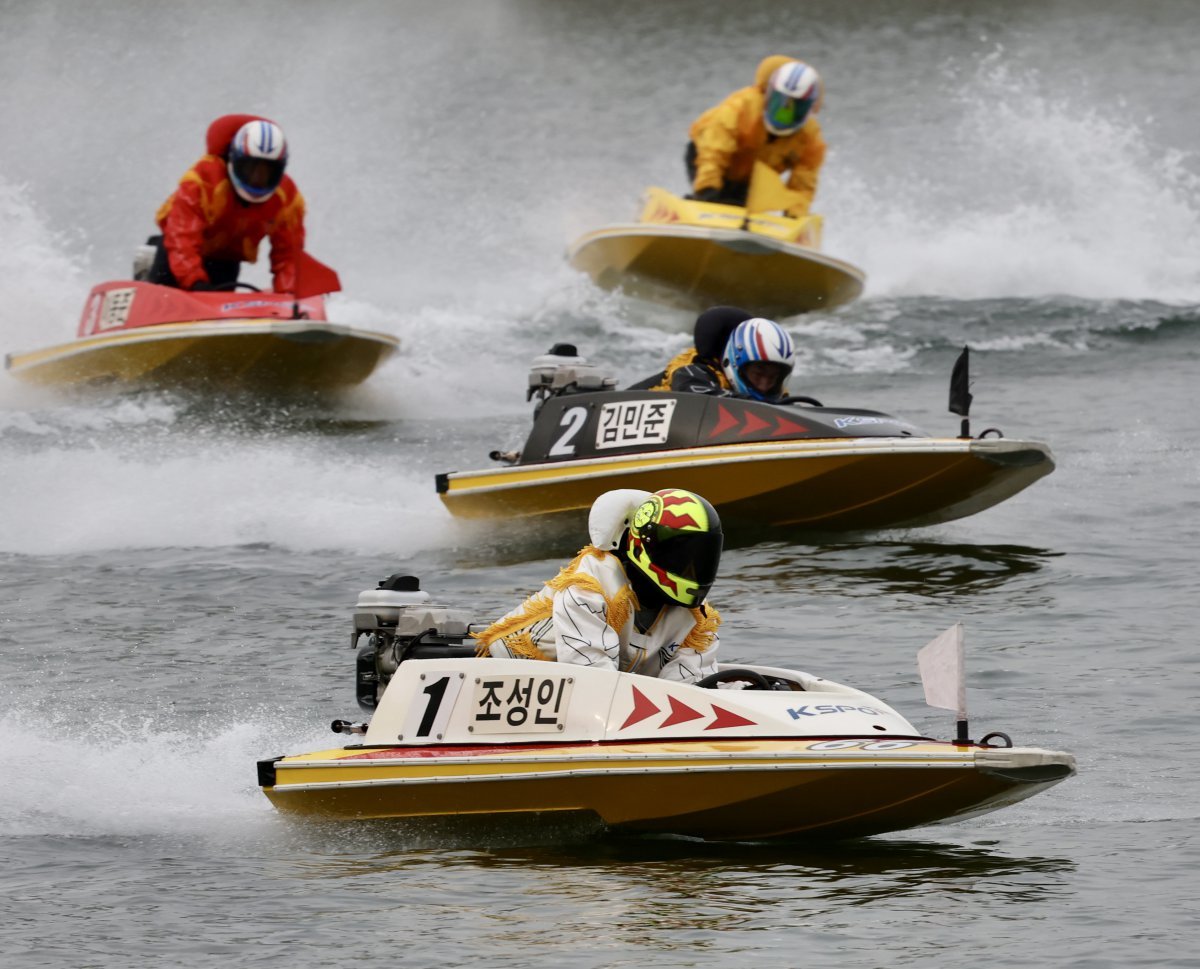 17일 미사경정장에서 진행한 ‘ 2025 스피드온배 대상 경정’에서 조성인, 김민준, 이동준 순으로 결승선을 향해 질주하고 있다 사진제공|국민체육진흥공단