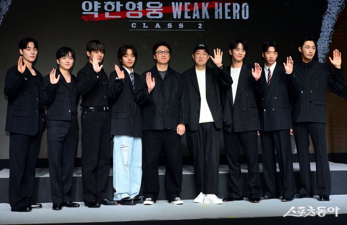 21일 서울 마포구 호텔 나루 엠갤러리에서 열린 넷플릭스 시리즈 ‘약한영웅 Class 2’ 제작발표회에 참석한 배우 이민재(왼쪽부터), 최민영, 려운, 박지훈, 유수민 감독, 한준희 기획총괄, 이준영, 유수빈, 배나라가 카메라를 향해 포즈를 취하고 있다. 김민성 기자 marineboy@donga.com