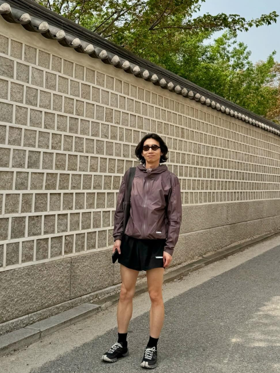 사진 속 봉태규는 광택 있는 퍼플톤 윈드브레이커에 블랙 쇼츠, 블랙 양말과 러닝화를 매치했다. 여기에 블랙 미니 백과 고글형 선글라스를 더해 단순한 운동복 차림을 패셔너블하게 소화했다. 전체적인 실루엣은 가볍고 활동적이지만, 색 조합과 액세서리 선택에서 그만의 취향이 분명히 드러난다.