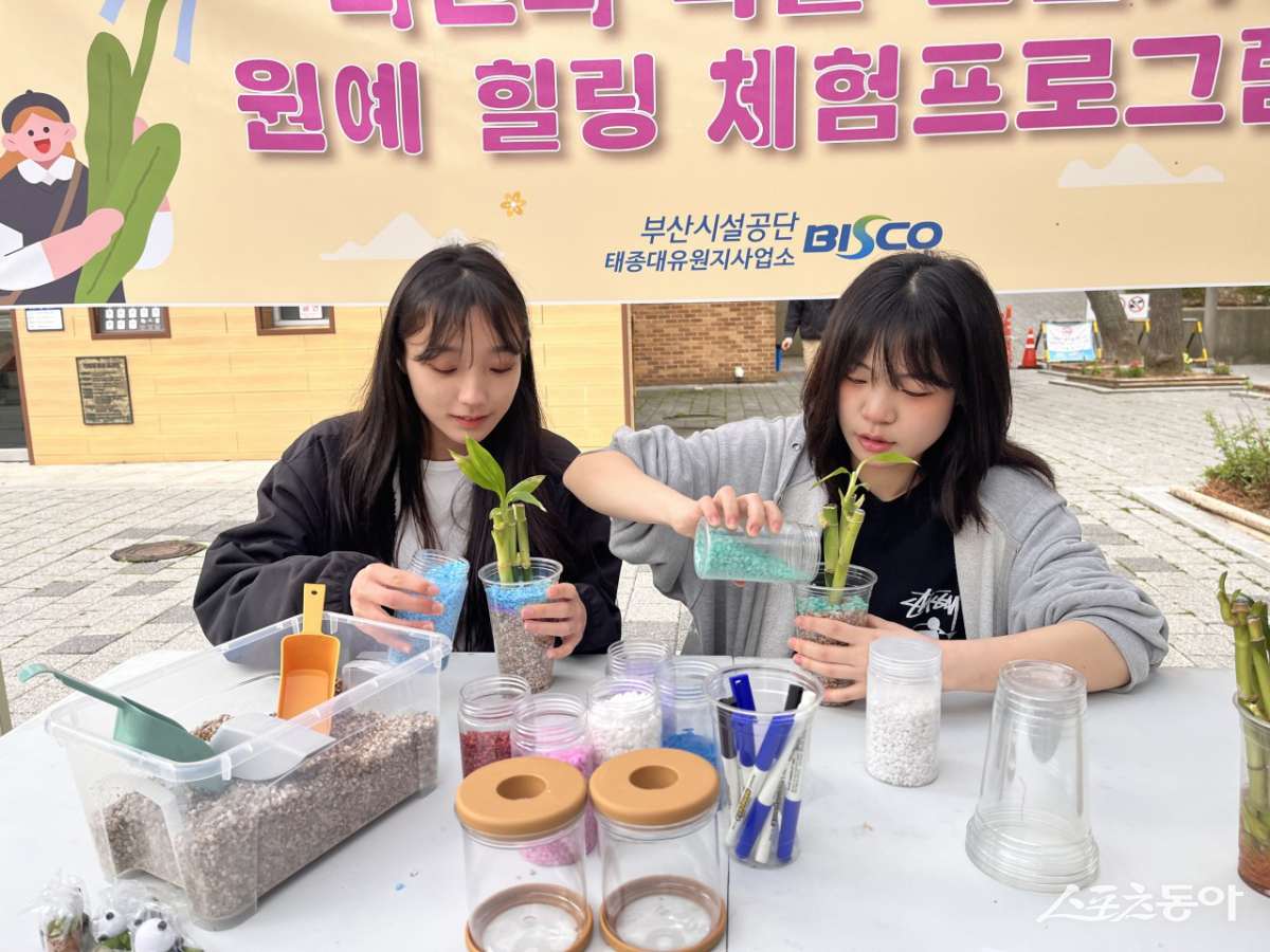 부산시설공단이 지역 소외계층과 태종대를 방문한 관광객 대상으로 반려식물을 키우는 즐거움과 힐링 기회를 제공하는 ‘나만의 식물 만들기 원예 힐링 체험 프로그램’ 행사를 진행했다. (사진제공=부산시설공단)