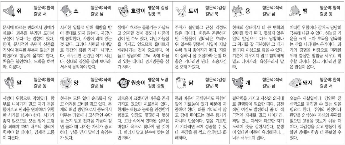 쥐띠 : 문서에따르는변화에서명예가따르나 과욕을 부리면 도리어구설이 뒤따르는 경향이 있다.명예, 문서적인 측면에 신중을기하여결여된부분이없는가를확인하고 행동에 옮겨야 한다.처음은 불안하다. 노력을 하여라. 이룬다.