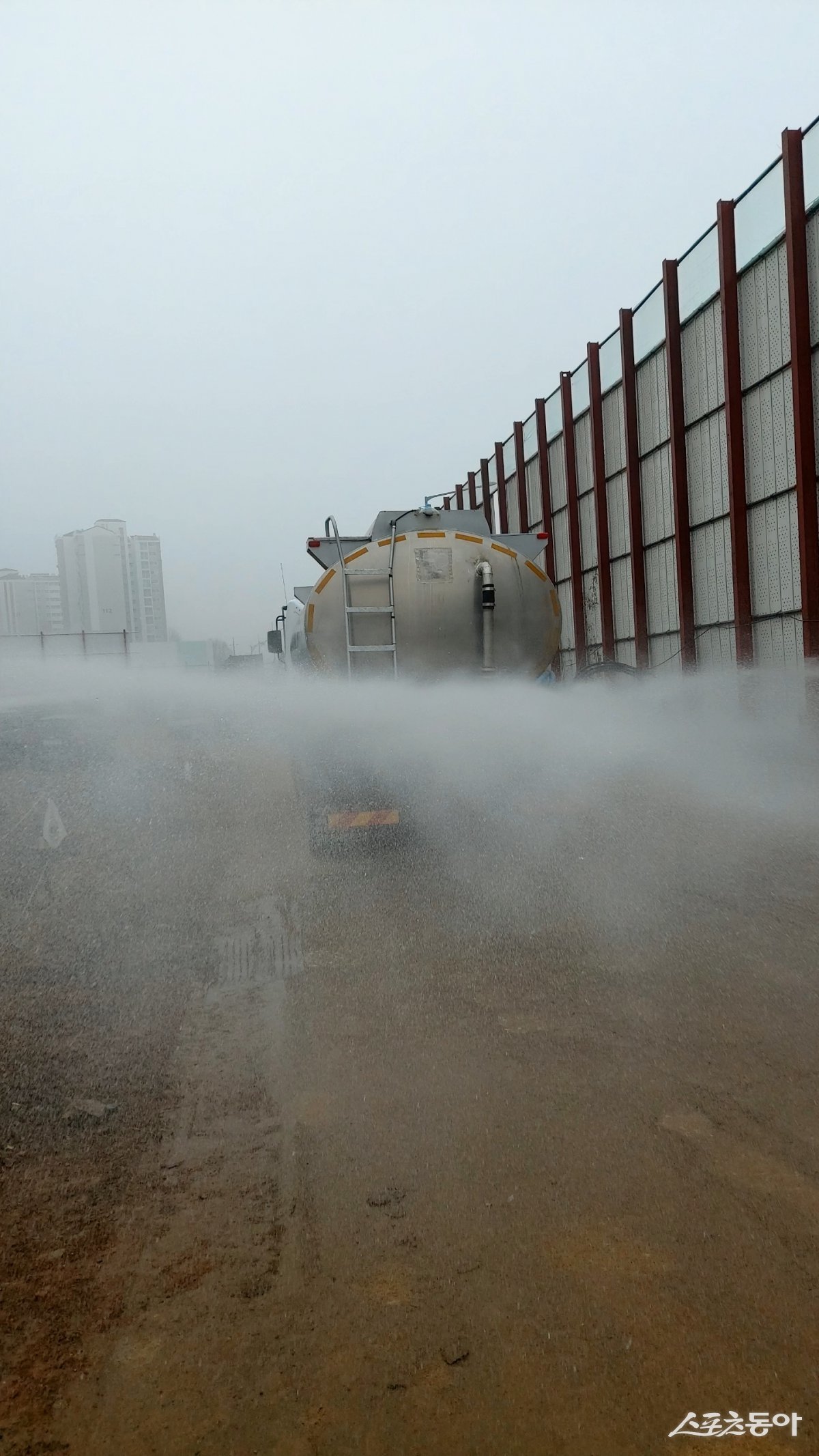 미세먼지 비상저감조치 시행에 따라 공사장에서 살수 강화 조치를 이행하고 있는 모습. 사진제공|부천시