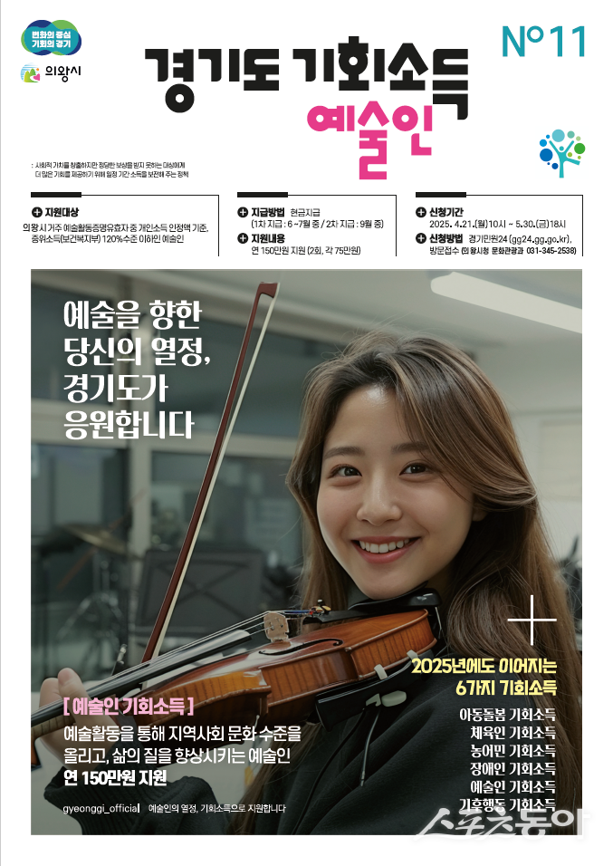 의왕시(시장 김성제)는 경기도와 협력해 지역 예술인들의 창작 활동을 장려하고 문화 예술의 사회적 가치를 확산하기 위해 ‘2025 경기도 예술인 기회소득’ 신청을 오는 5월 30일까지 받는다.