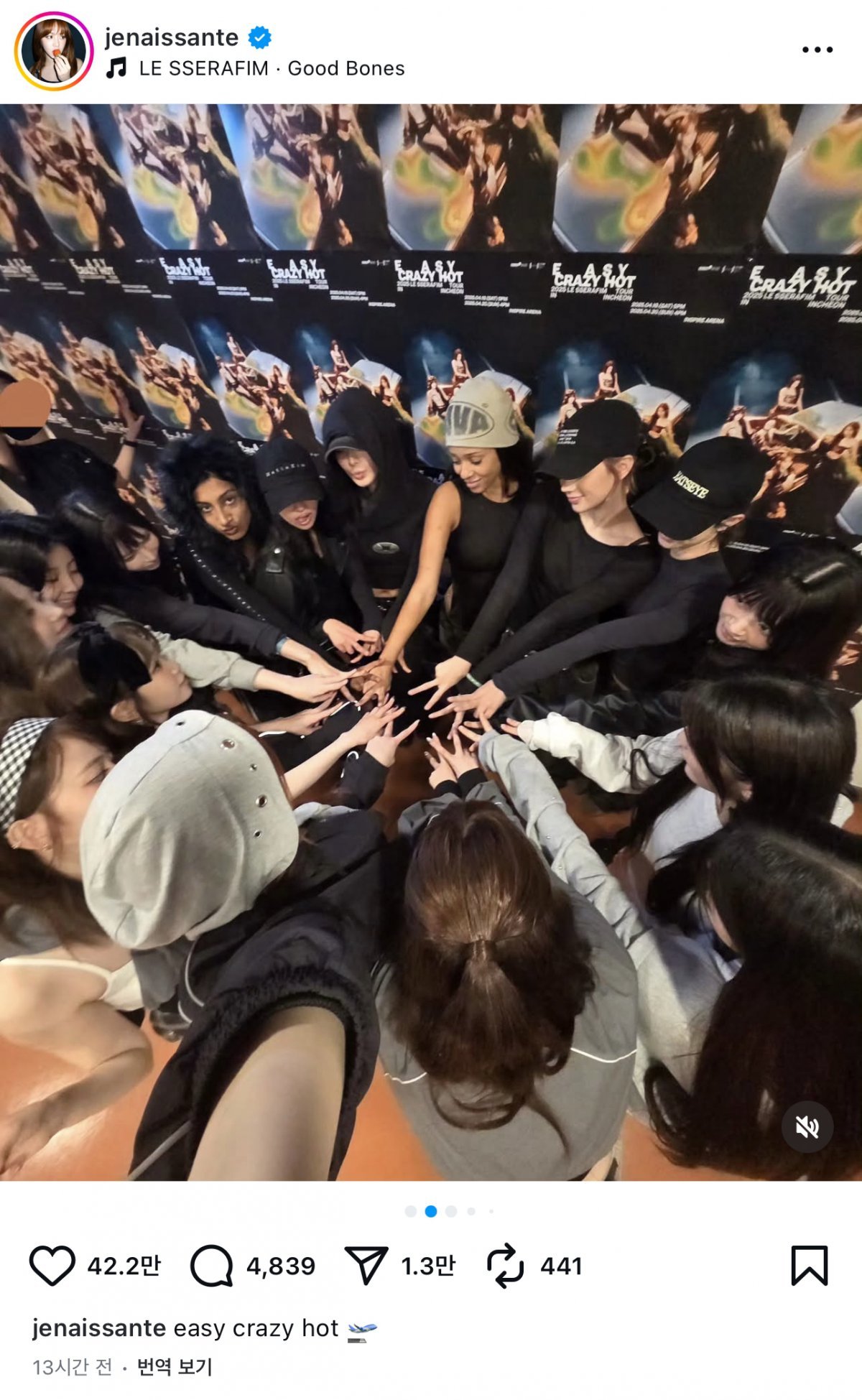 르세라핌 멤버 허윤진이 21일 밤 개인 SNS에 올린 사진이 그것으로, 지난 주말 성황리 마무리된 르세라핌 콘서트 무대 뒤에 모여 촬영한 것으로 보인다. 해당 사진은 게시 반나절도 안 돼 좋아요 42만을 넘어섰고, 흔히 ‘RT’라 표현되는 재전송 횟수 또한 1만회를 돌파했다.
