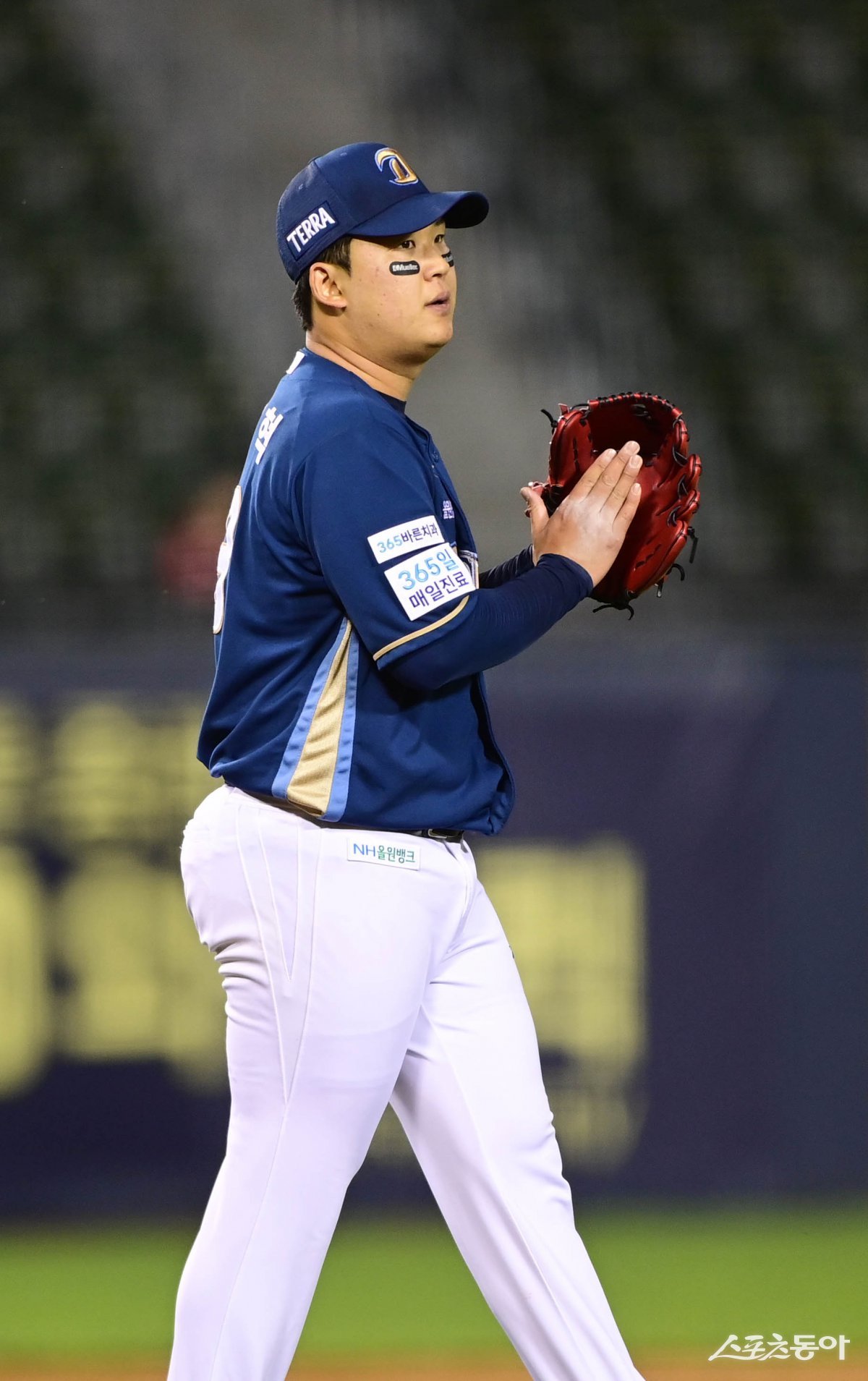 22일 서울 잠실야구장에서 열린 ‘2025 신한 SOL Bank KBO리그’ NC 다이노스와 LG 트윈스의 경기에서 4회말 1사 LG에 땅볼 때 NC 선발 투수 신민혁이 호수비에 손뼉을 치고 있다. 잠실 | 주현희 기자 teth1147@donga.com