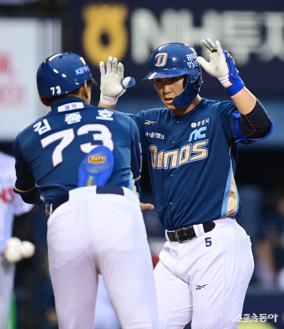 22일 서울 잠실야구장에서 열린 ‘2025 신한 SOL Bank KBO리그’ NC 다이노스와 LG 트윈스의 경기에서 2회초 1사 1루 NC 서호철이 좌월 2점 홈런을 친 후 1루코치와 기쁨을 나누고 있다. 잠실 | 주현희 기자 teth1147@donga.com