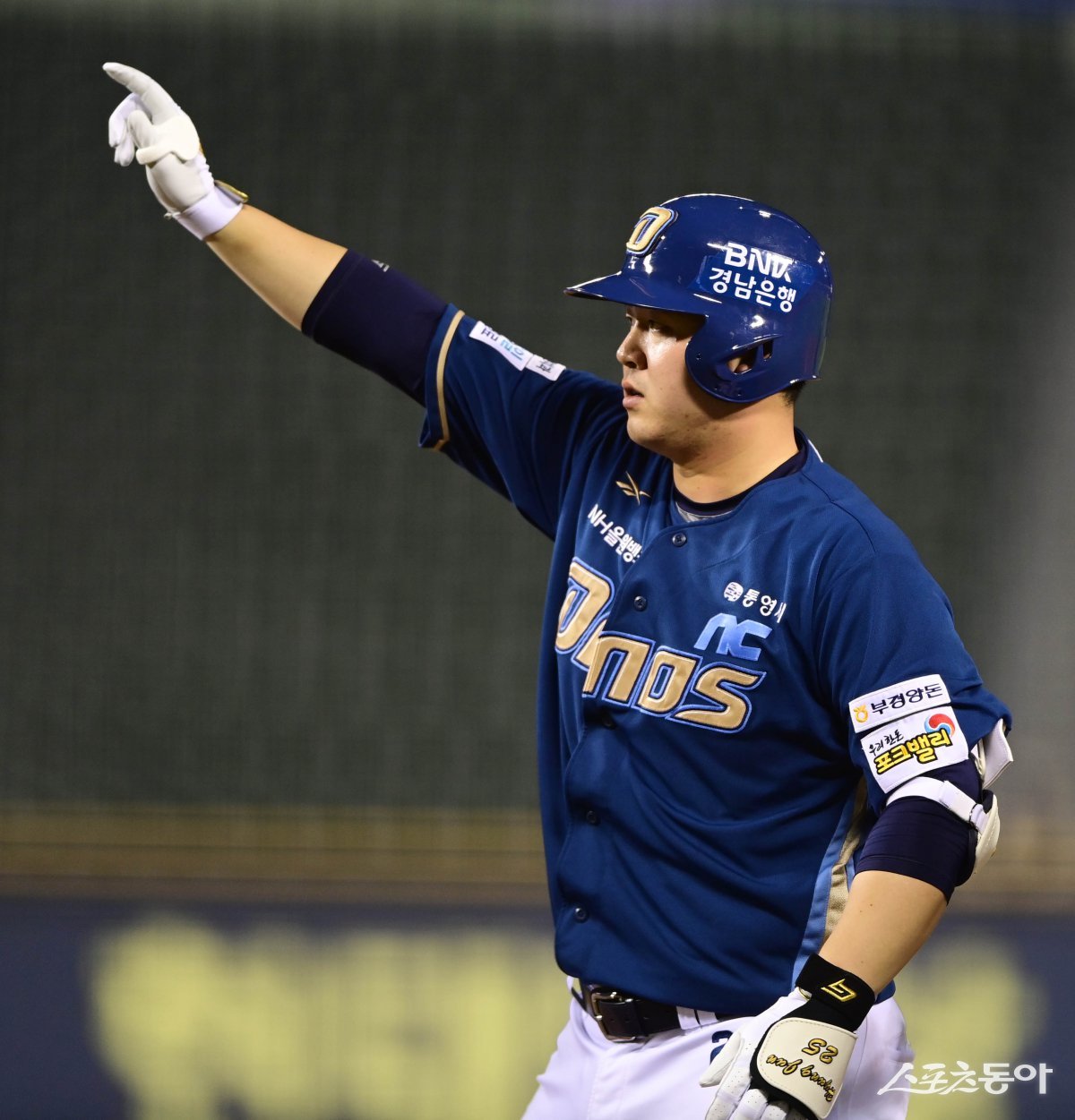 22일 서울 잠실야구장에서 열린 ‘2025 신한 SOL Bank KBO리그’ NC 다이노스와 LG 트윈스의 경기에서 4회초 1사 2루 NC 김형준이 역전 1타점 좌전 적시타를 친 후 세리머니를 하고 있다. 잠실 | 주현희 기자 teth1147@donga.com
