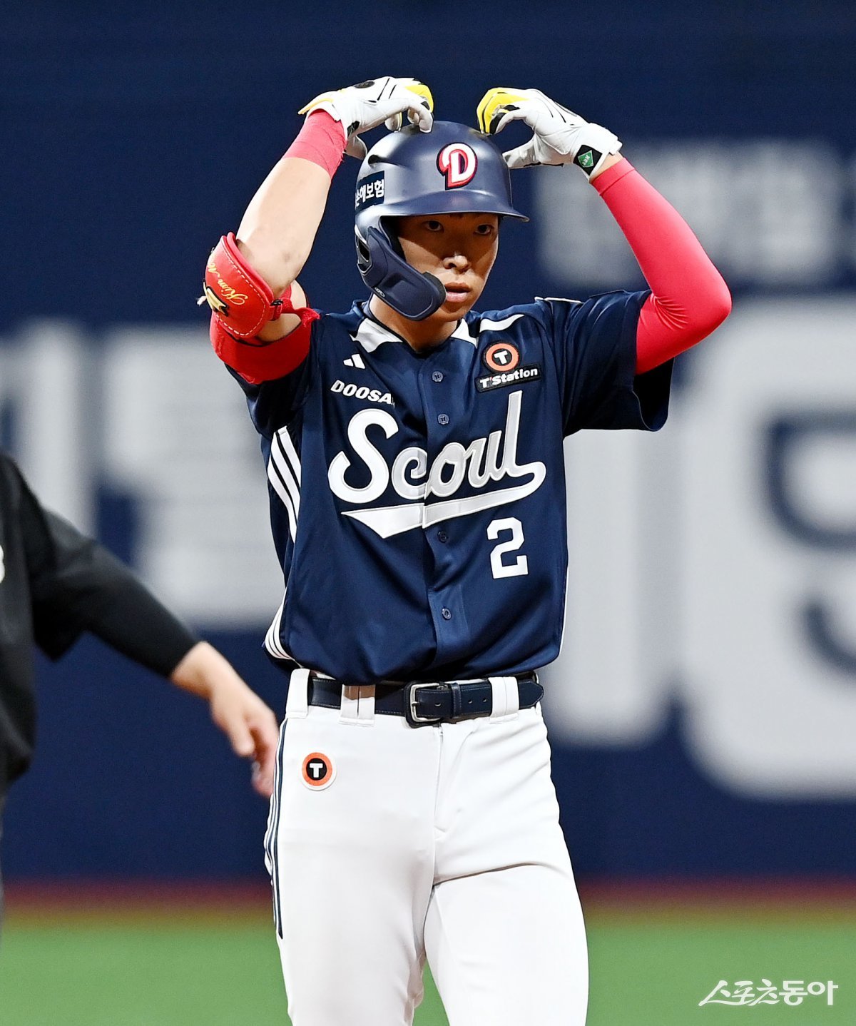 22일 서울 고척스카이돔에서 ‘2025 신한 SOL 뱅크 KBO리그’ 키움 히어로즈와 두산 베어스의 경기가 열렸다. 5회말 무사 2루에서 두산 김민석이 1타점 2루타를 날린 후 세리머니를 펼치고 있다. 고척 | 김민성 기자 marineboy@donga.com