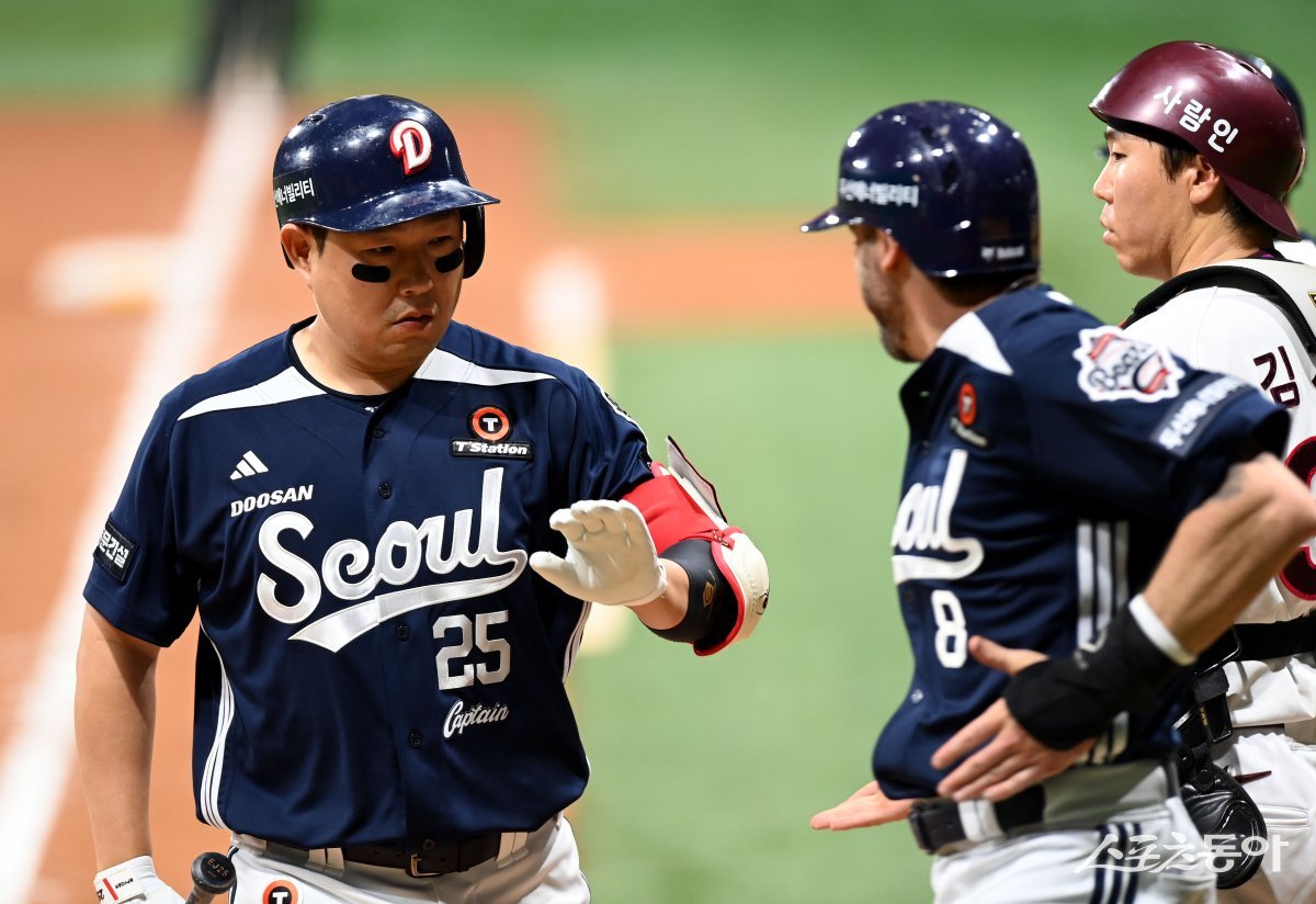 22일 서울 고척스카이돔에서 ‘2025 신한 SOL 뱅크 KBO리그’ 키움 히어로즈와 두산 베어스의 경기가 열렸다. 9회초 1사 1루에서 두산 양의지가 투런 홈런을 쏘아 올린 후 동료와 기쁨을 나누고 있다. 고척 | 김민성 기자 marineboy@donga.com