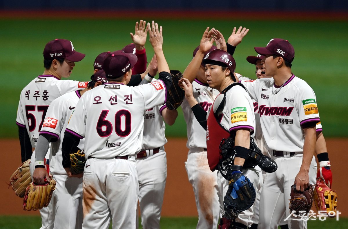 22일 서울 고척스카이돔에서 ‘2025 신한 SOL 뱅크 KBO리그’ 키움 히어로즈와 두산 베어스의 경기가 열렸다. 키움이 두산을 상대로 5-4 승리를 거둔 후 선수들이 그라운드에서 기쁨을 나누고 있다. 고척 | 김민성 기자 marineboy@donga.com