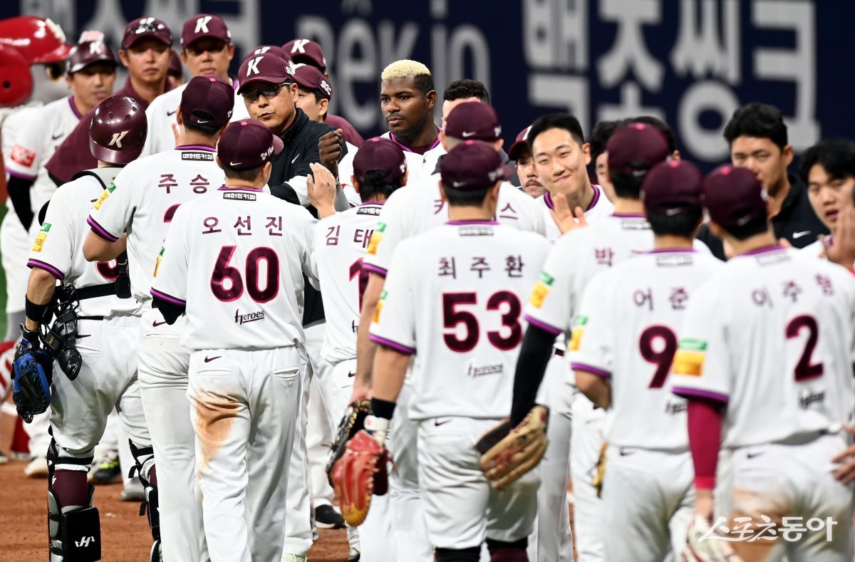 22일 서울 고척스카이돔에서 ‘2025 신한 SOL 뱅크 KBO리그’ 키움 히어로즈와 두산 베어스의 경기가 열렸다. 키움이 두산을 상대로 5-4 승리를 거둔 후 선수들이 그라운드에서 기쁨을 나누고 있다. 고척 | 김민성 기자 marineboy@donga.com