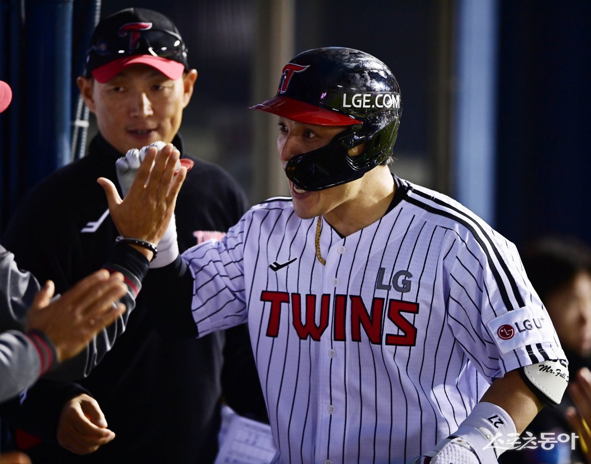 22일 서울 잠실야구장에서 열린 ‘2025 신한 SOL Bank KBO리그’ NC 다이노스와 LG 트윈스의 경기에서 9회말 무사 LG 박동원이 좌월 동점 솔로 홈런을 친 후 포효하고 있다. 잠실 | 주현희 기자 teth1147@donga.com
