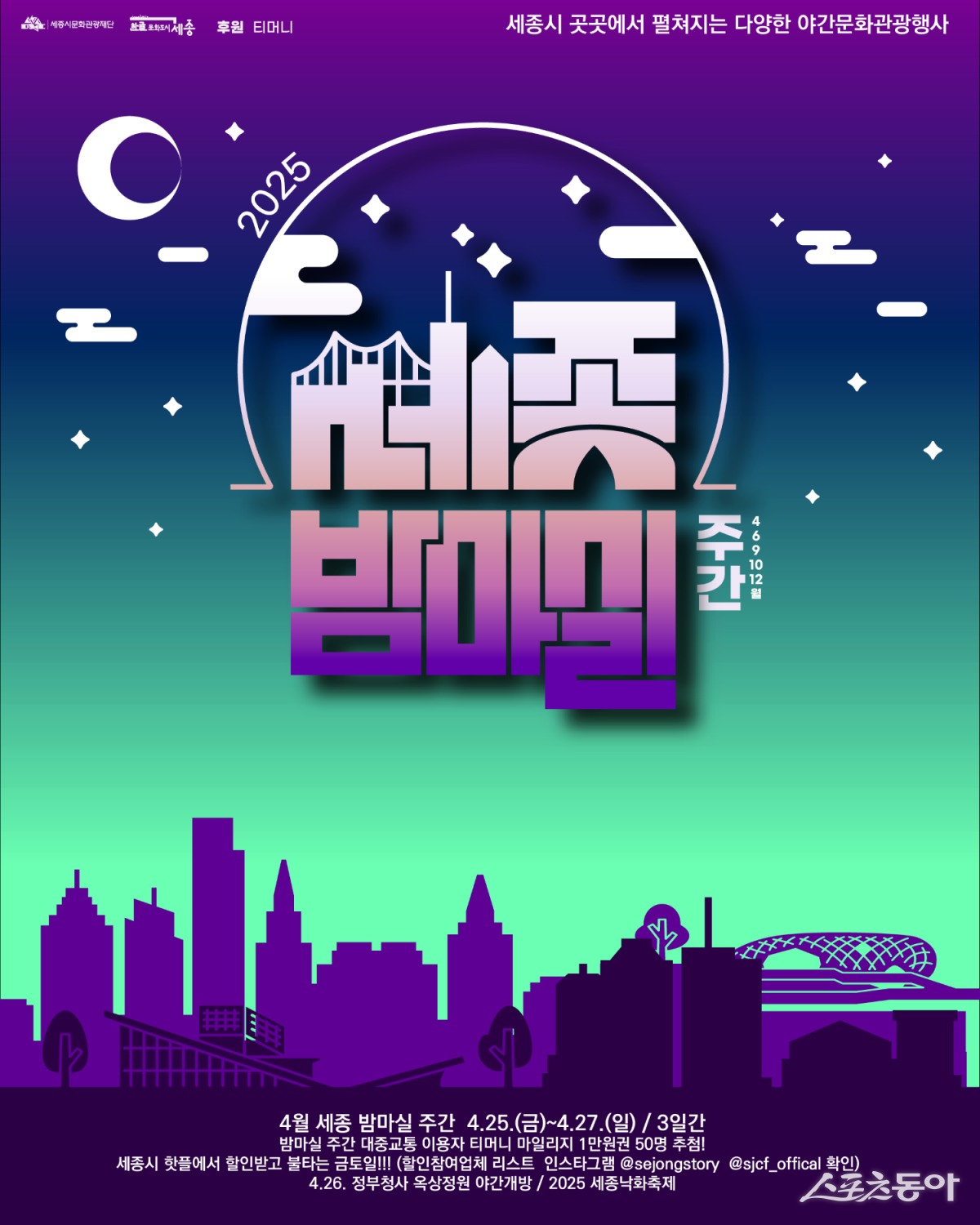 세종시와 세종시문화관광재단(대표 박영국)은 오는 26일 개최되는 세종낙화축제를 전후해 4월 25일부터 27일까지 사흘간 ‘4월 밤마실 주간’을 운영한다. ‘세종 밤마실 주간’은 주요 축제나 행사가 있는 기간에 맞춰 낮부터 밤까지 즐길 수 있는 다양한 프로그램을 집중적으로 제공해 세종시의 야간 문화 관광 매력을 높이는 것을 목표로 올해 4월을 시작으로 6월, 9월, 10월, 12월까지 총 5회에 걸쳐 진행될 예정이다.