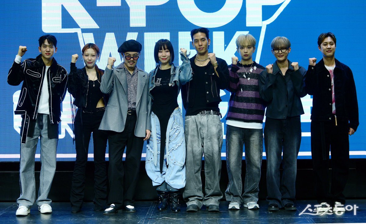23일 서울 서교동 홍대 H-스테이지에서 ‘K-POP WEEK in HONGDEA(K팝 위크 인 홍대)’ 기자간담회가 열렸다. 류필립(왼쪽부터), 군조크루, 김시훈, 강현우, 양승호가 카메라를 향해 포즈를 취하고 있다. 김민성 기자 marineboy@donga.com