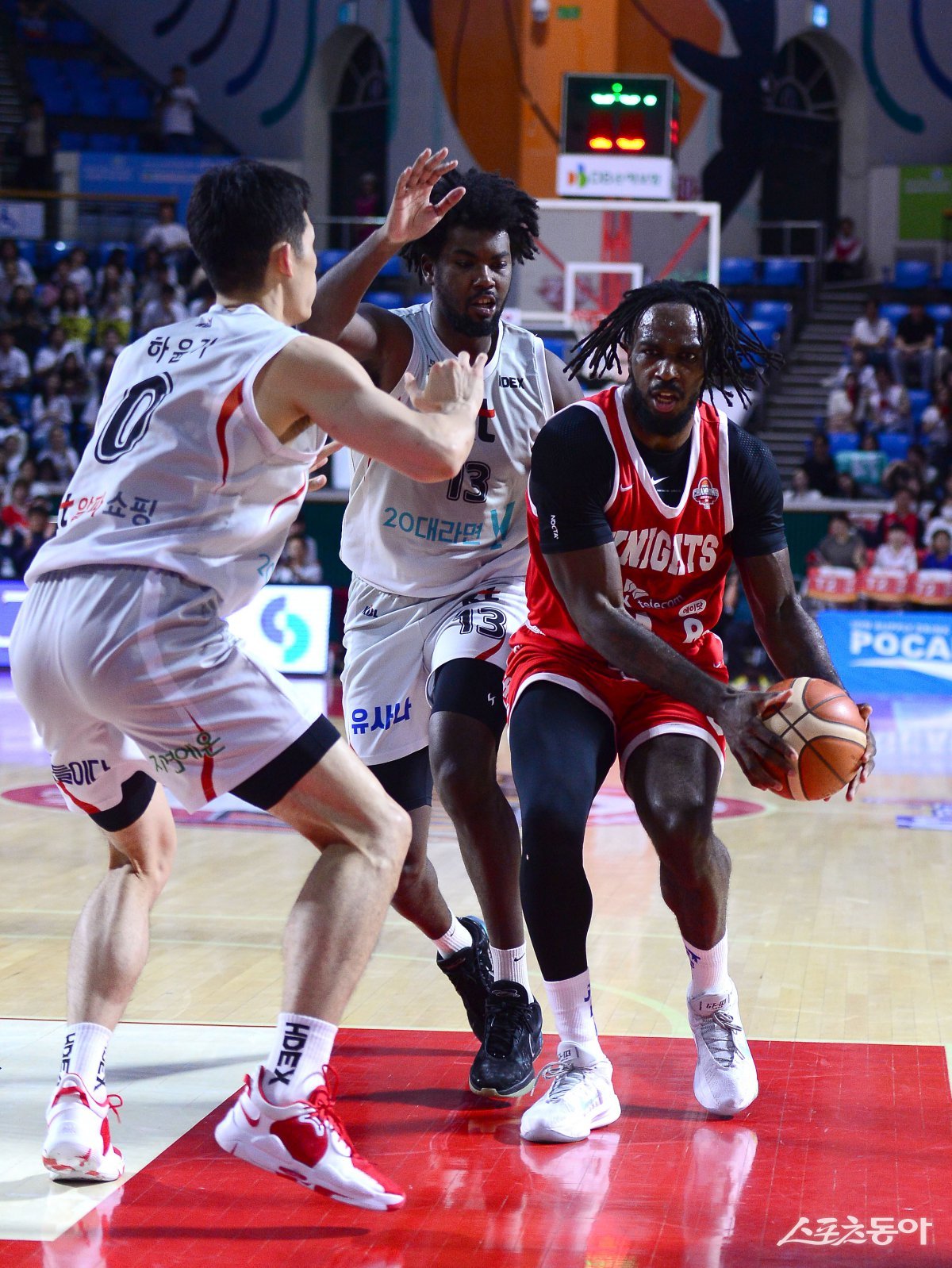 23일 서울 잠실학생체육관에서 열린 ‘2024-2025 프로농구’ 4강 플레이오프 1차전 SK와 KT 경기에서 SK 워니가 KT의 수비를 뚫고 골밑을 공격하고 있다. 잠실|김종원 기자 won@donga.com