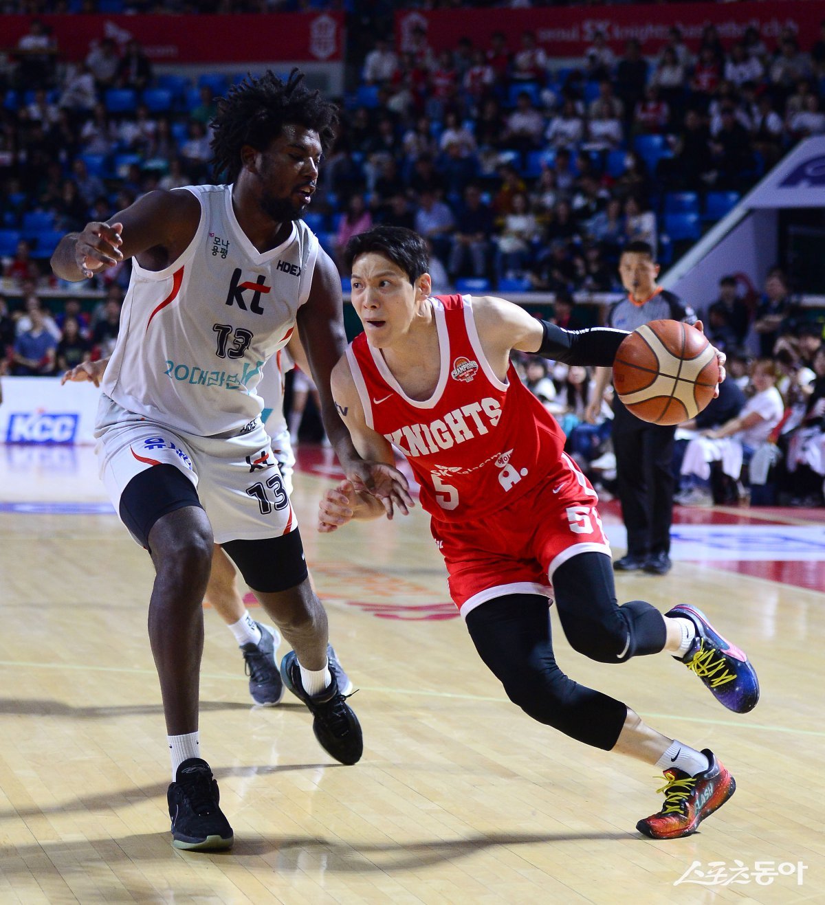 23일 서울 잠실학생체육관에서 열린 ‘2024-2025 프로농구’ 4강 플레이오프 1차전 SK와 KT 경기에서 SK 김선형이 KT의 수비를 뚫고 골밑을 공격하고 있다. 잠실|김종원 기자 won@donga.com