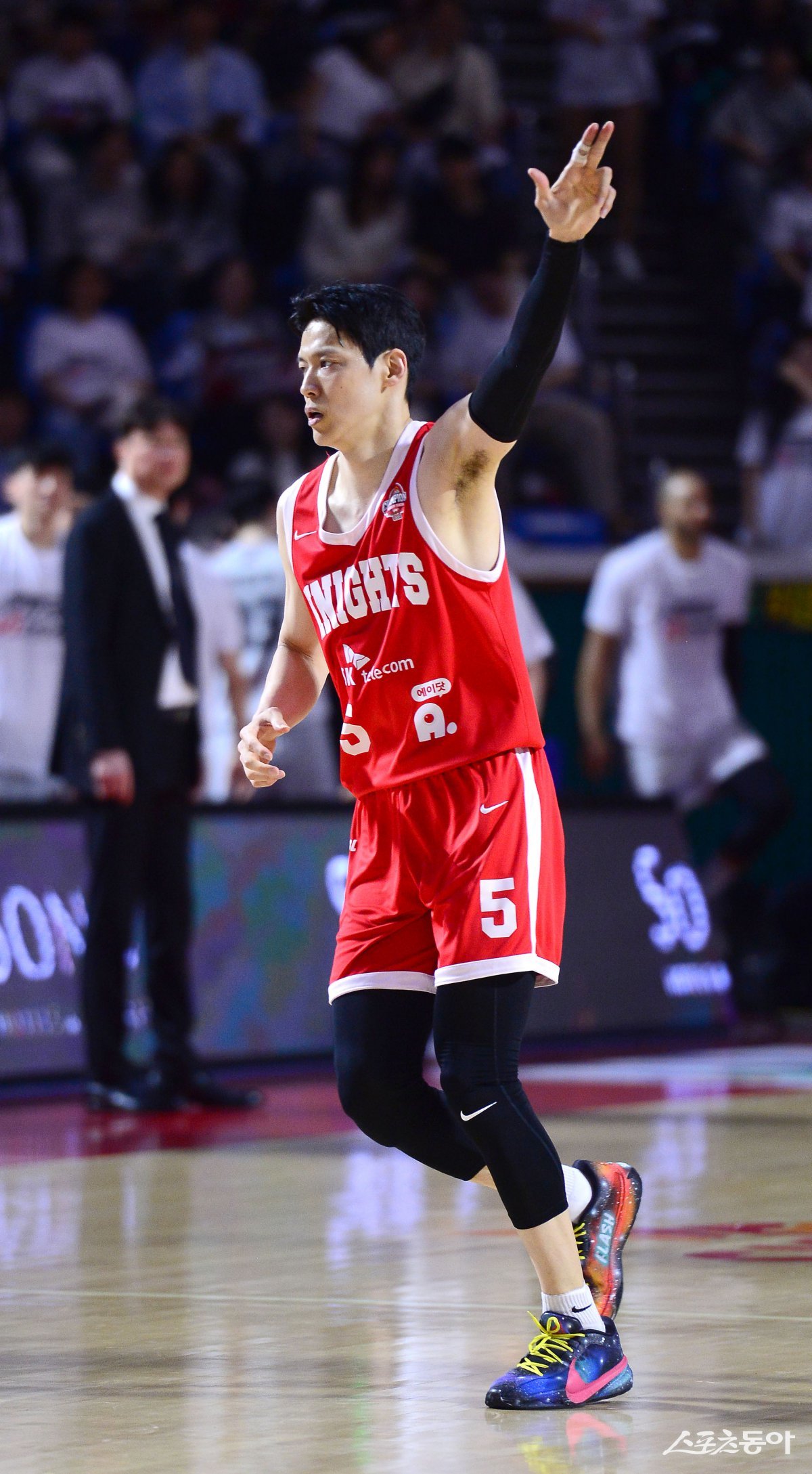 23일 서울 잠실학생체육관에서 열린 ‘2024-2025 프로농구’ 4강 플레이오프 1차전 SK와 KT 경기에서 SK 김선형이 3점슛을 성공시킨 후 기뻐하고있다. 잠실|김종원 기자 won@donga.com