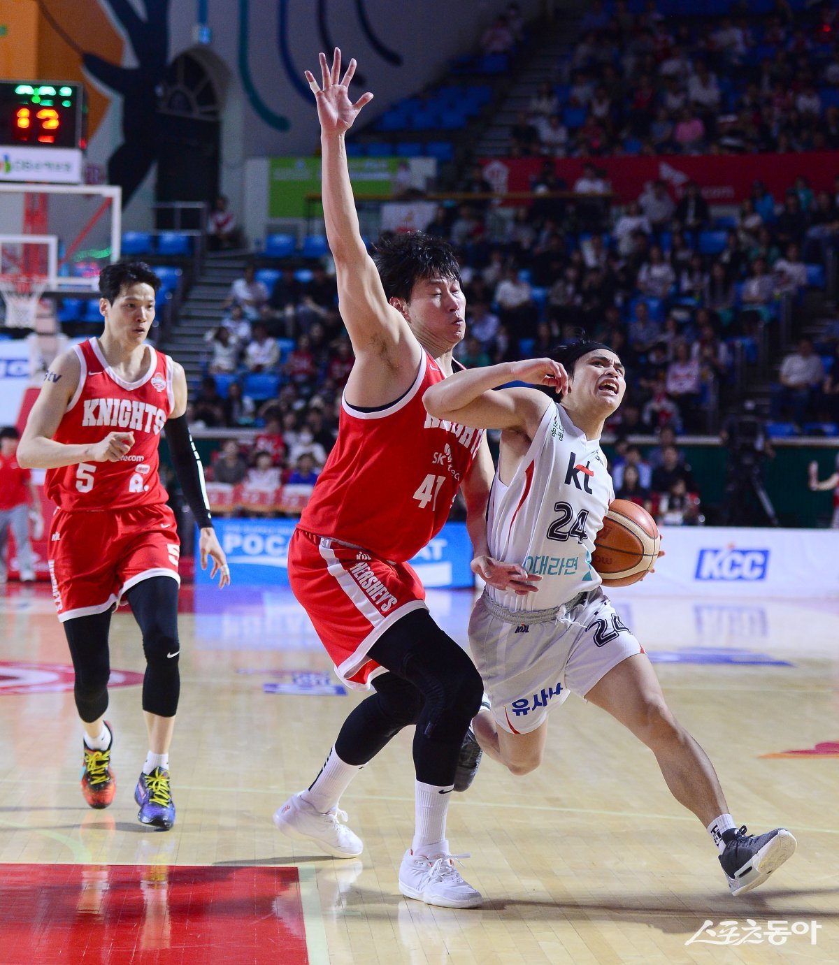 23일 서울 잠실학생체육관에서 열린 ‘2024-2025 프로농구’ 4강 플레이오프 1차전 SK와 KT 경기에서 KT 카룰랑안이 SK의 수비를 뚫고 골밑을 공격하고 있다. 잠실|김종원 기자 won@donga.com