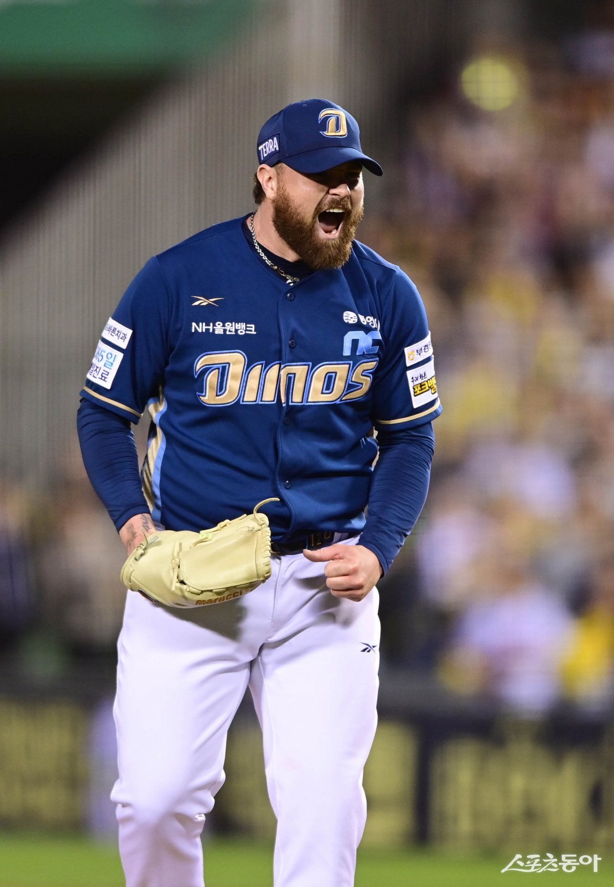 23일 서울 잠실야구장에서 열린 ‘2025 신한 SOL Bank KBO리그’ NC 다이노스와 LG 트윈스의 경기에서 4회말 무실점으로 수비를 마친 NC 로건이 포효하고 있다. 잠실 | 주현희 기자 teth1147@donga.com