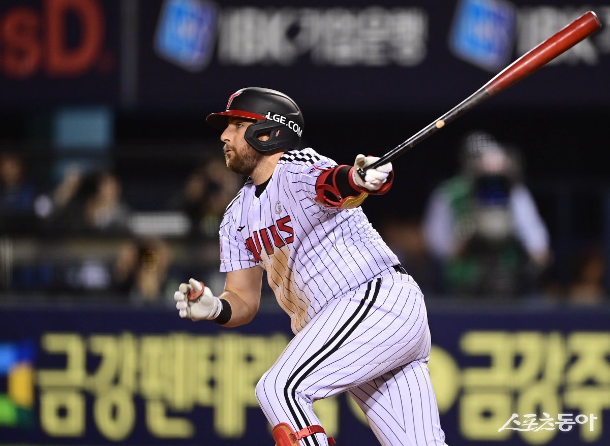23일 서울 잠실야구장에서 열린 ‘2025 신한 SOL Bank KBO리그’ NC 다이노스와 LG 트윈스의 경기에서 5회말 무사 1루 LG 오스틴이 좌전 2루타를 치고 있다. 잠실 | 주현희 기자 teth1147@donga.com