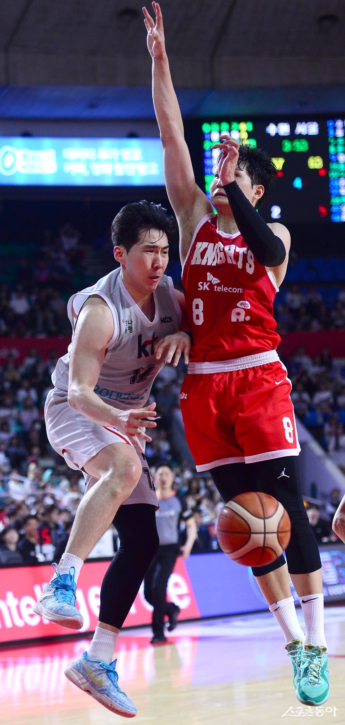 23일 서울 잠실학생체육관에서 열린 ‘2024-2025 프로농구’ 4강 플레이오프 1차전 SK와 KT 경기에서 KT 문정현이 SK의 수비를 뚫고 골밑 패스를 하고 있다. 잠실|김종원 기자 won@donga.com
