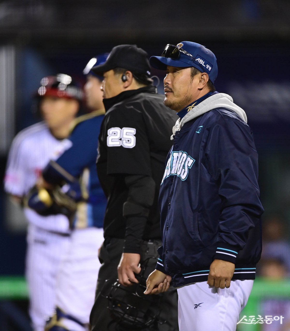 23일 서울 잠실야구장에서 열린 ‘2025 신한 SOL Bank KBO리그’ NC 다이노스와 LG 트윈스의 경기에서 7회말 2사 1, 2루 NC 이호준 감독이 최성영에 대한 보크 선언에 어필하고 있다. 잠실 | 주현희 기자 teth1147@donga.com