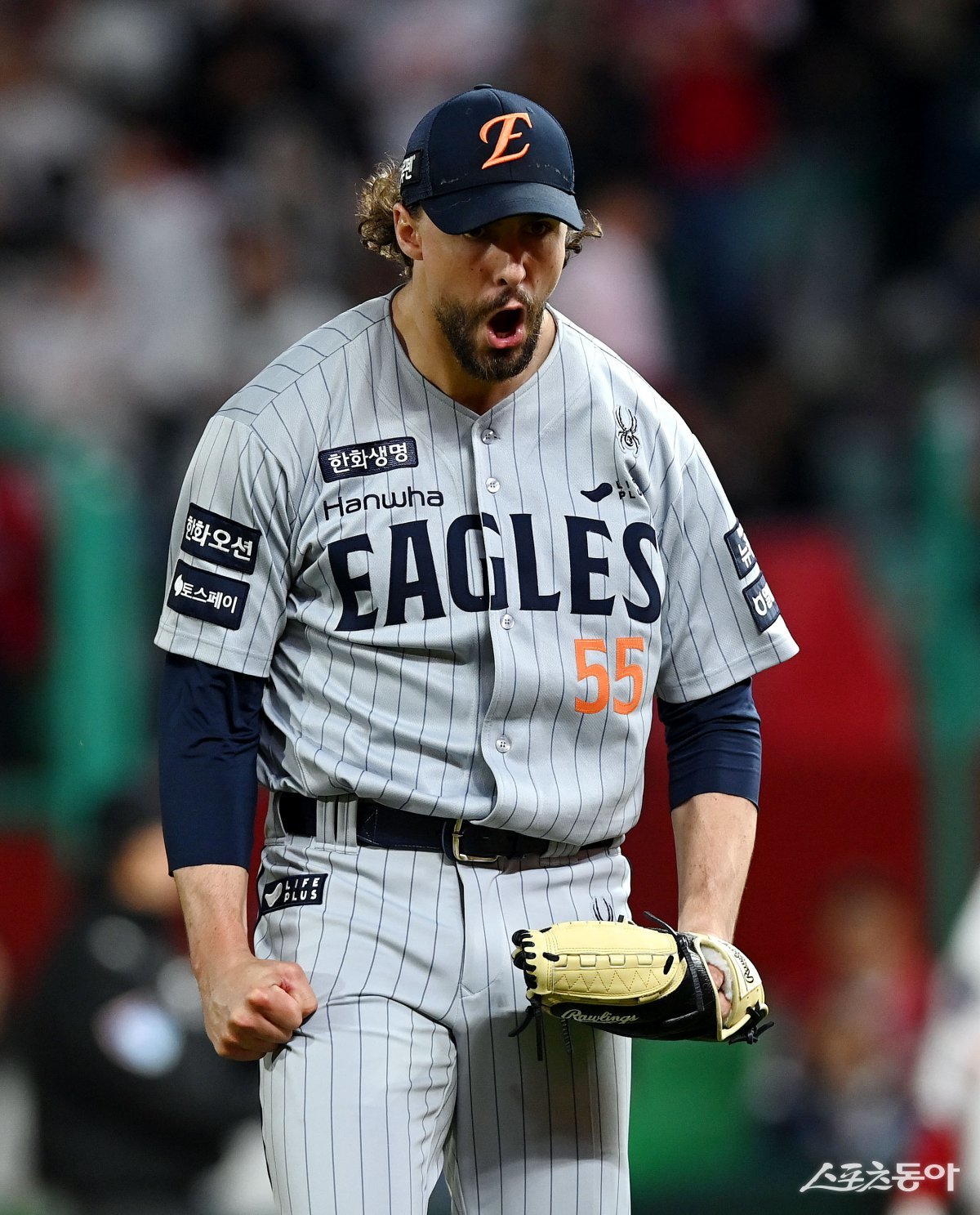 16일 인천 SSG 랜더스필드에서 ‘2025 신한 SOL 뱅크 KBO리그’ SSG 랜더스와 한화 이글스의 경기가 열렸다. 6회까지 SSG 공격을 2실점으로 막은 한화 선발 와이스가 이닝 종료 후 환호하고 있다. 인천 | 김민성 기자 marineboy@donga.com