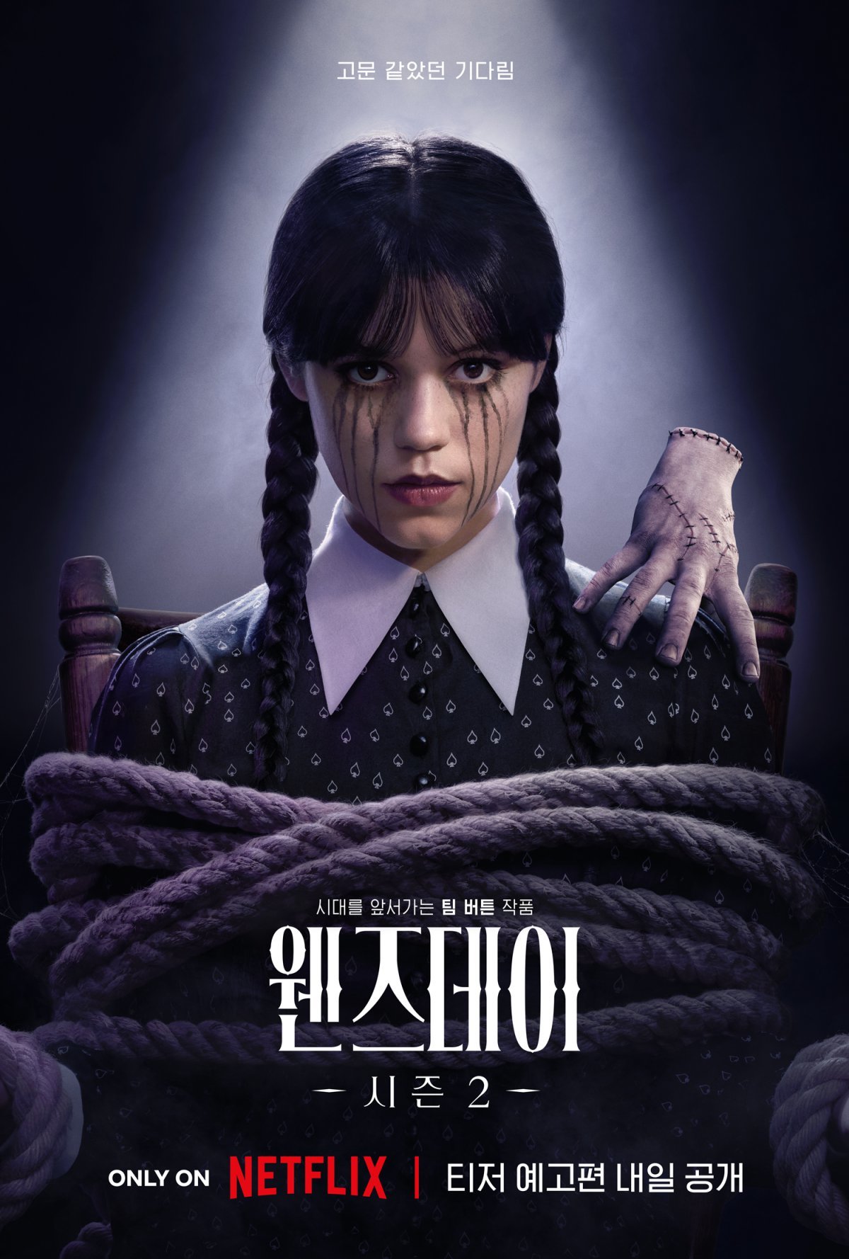 지난 4월 22일(화) 공개된 티저 포스터는 “고문 같았던 기다림”이라는 카피와 함께, 밧줄에 묶인 채 앉아 있는 ‘웬즈데이’의 모습으로 시선을 사로잡는다. 납치된 것 같은 상황임에도 그 어떤 두려움도 없어 보이는 ‘웬즈데이’의 무심한 표정은 전 세계 시청자들을 매혹시켰던 ‘웬즈데이’만의 독보적인 매력을 다시금 떠오르게 만든다. 여기에 ‘웬즈데이’의 눈에서 흐르고 있는 검은 눈물과, 그의 어깨 위에 자리 잡은 ‘씽’의 모습은 둘도 없는 파트너였던 ‘웬즈데이’와 ‘씽’이 어떤 기이하고 미스터리한 일들을 함께 헤쳐 나갈지 기대를 더한다.