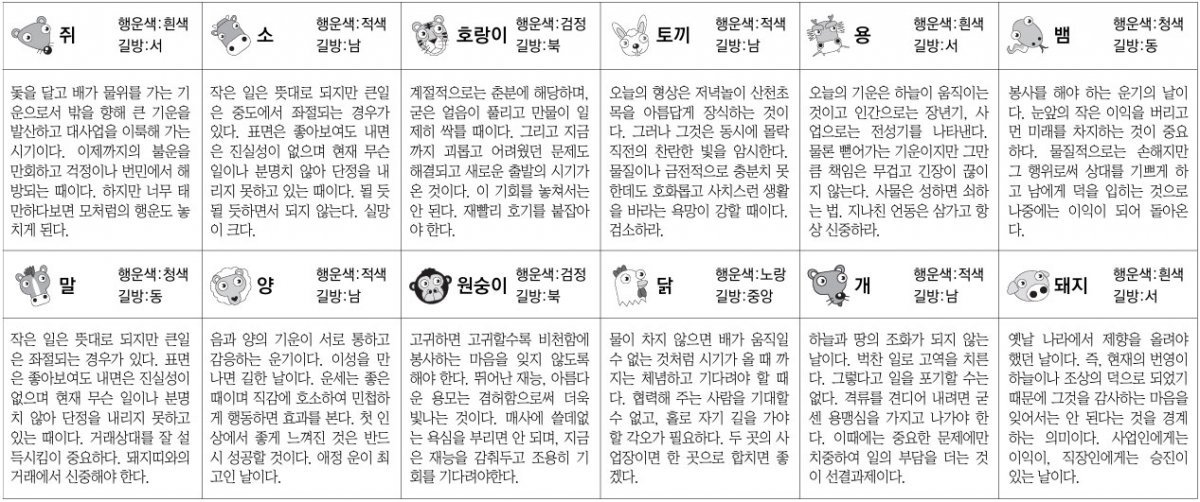 개띠 : 하늘과땅의조화가되지않는날이다.벅찬일로고역을치른다.그렇다고일을포기할수는없다.격류를견디어내려면굳센용맹심을가지고나가야한다.이때에는중요한문제에만치중하여일의부담을더는것이선결과제이다.