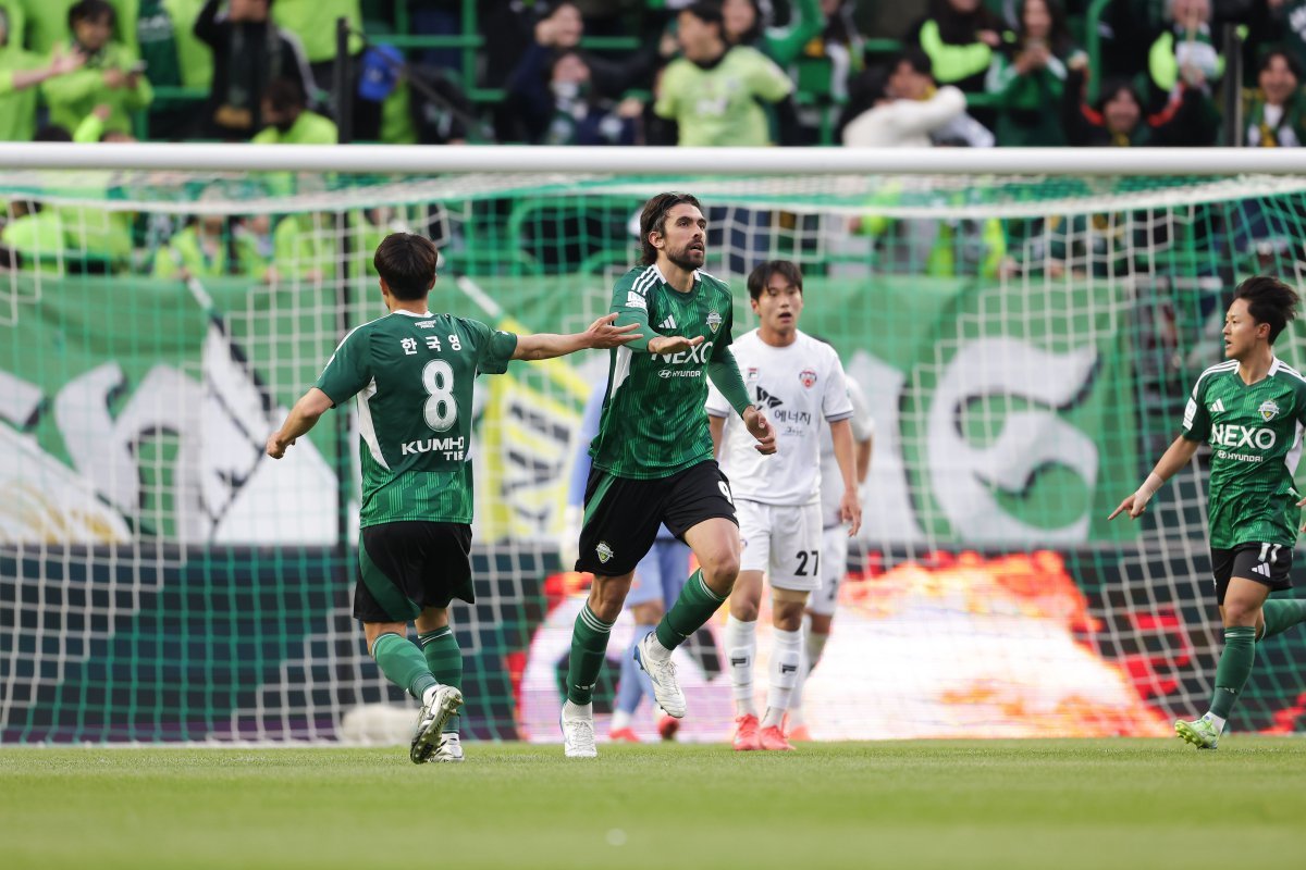 둘 모두 득점 부문 선두그룹에 속했다. 콤파뇨와 전진우는 공동 2위다. 그 위로는 10경기를 뛰고 7골을 터트린 대전하나의 국가대표 골게터 주민규가 유일하다. 그런데 전북 콤비의 골 순도가 더 높았다. 콤파뇨는 7경기(유효슛 11회), 전진우는 9경기(유효슛 10회)를 뛰었다.
