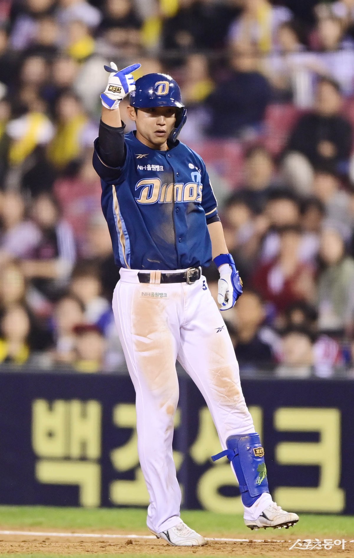 24일 서울 잠실야구장에서 열린 ‘2025 신한 SOL Bank KBO리그’ NC 다이노스와 LG 트윈스의 경기에서 4회초 1사 2, 3루 NC 서호철이 선제 2타점 우전 적시타를 친 후 세리머니를 하고 있다. 잠실 | 주현희 기자 teth1147@donga.com