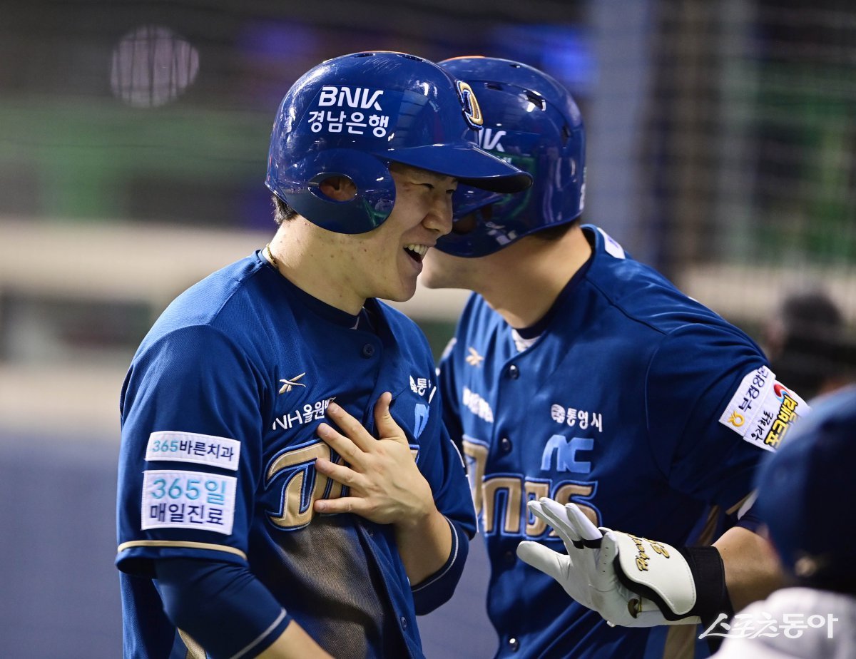24일 서울 잠실야구장에서 열린 ‘2025 신한 SOL Bank KBO리그’ NC 다이노스와 LG 트윈스의 경기에서 4회초 1사 2, 3루 NC의 적시타에 득점에 성공한 3루주자 박민우가 동료들과 기쁨을 나누고 있다. 잠실 | 주현희 기자 teth1147@donga.com